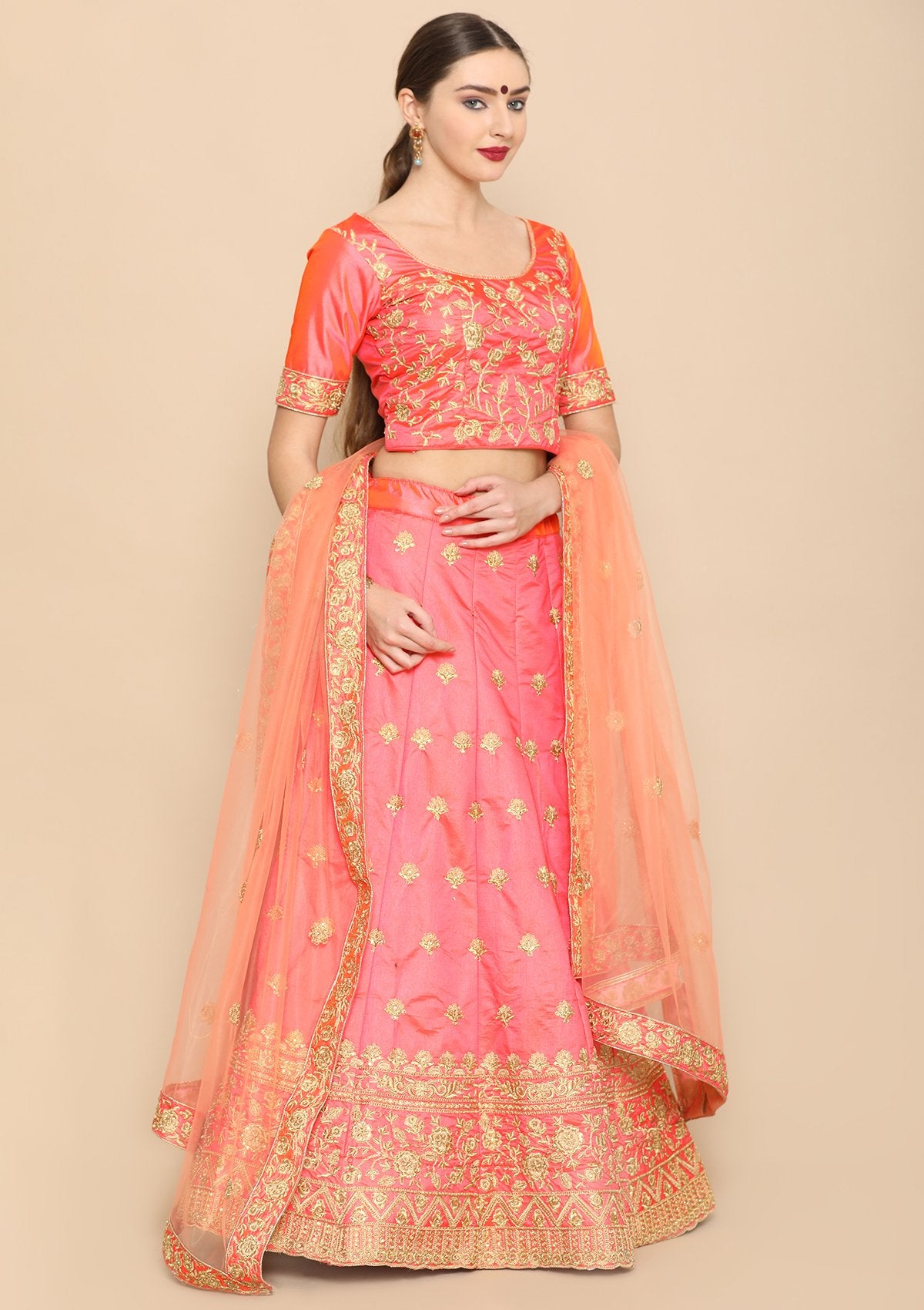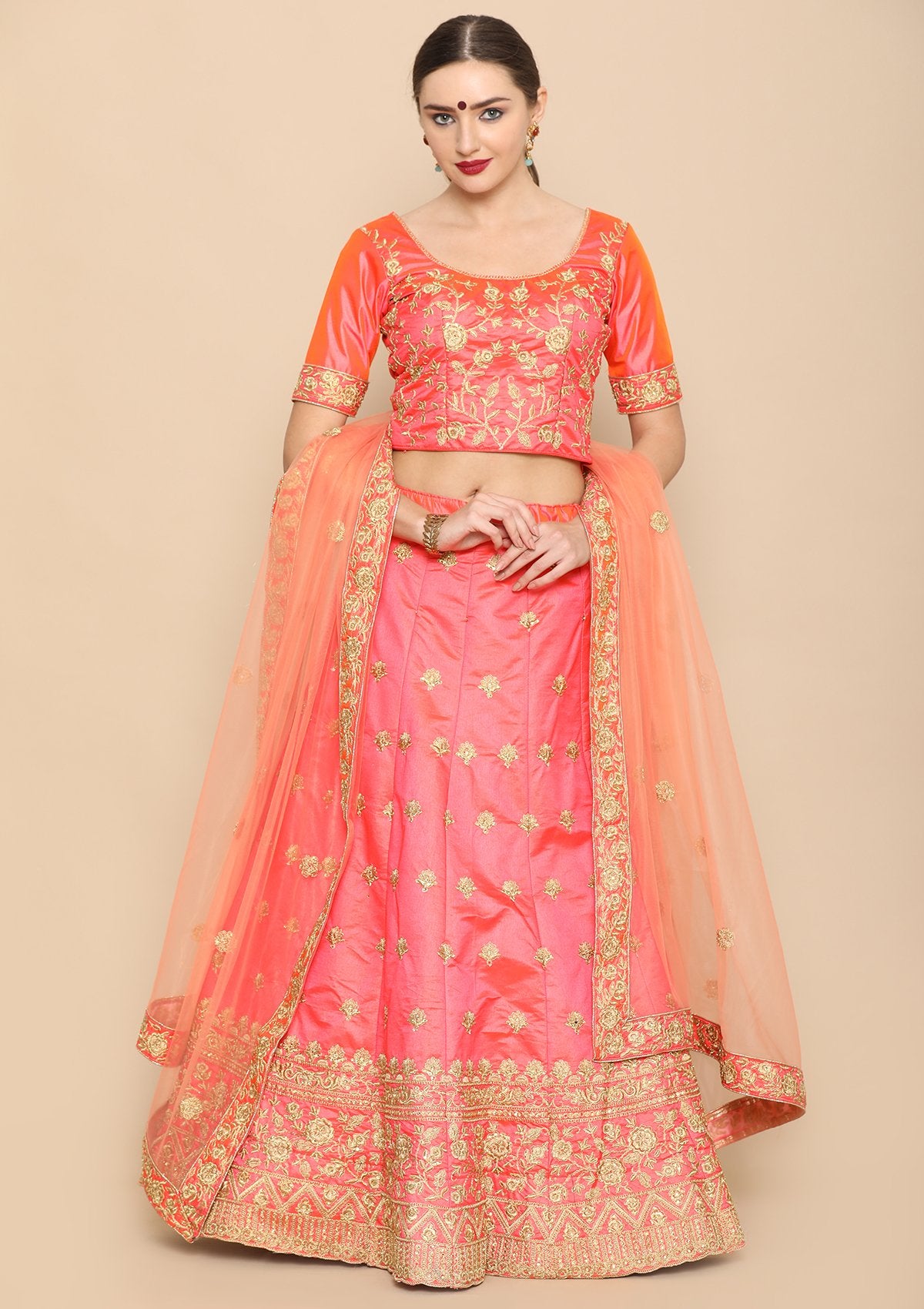Orange Zariwork Taffeta Silk Semi Stitched Lehenga