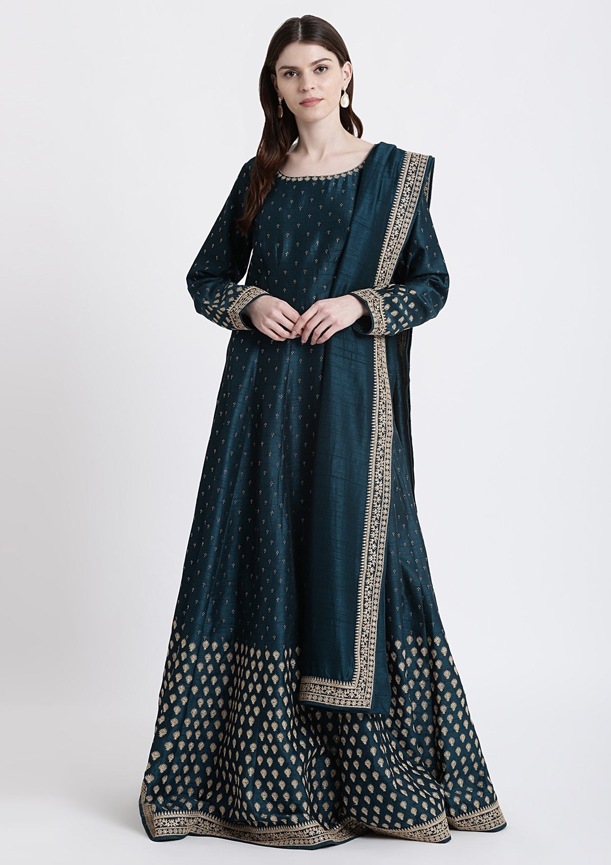 Peacock Blue Zariwork Rawsilk Designer Gown