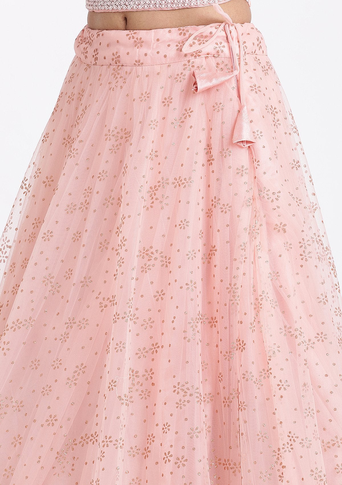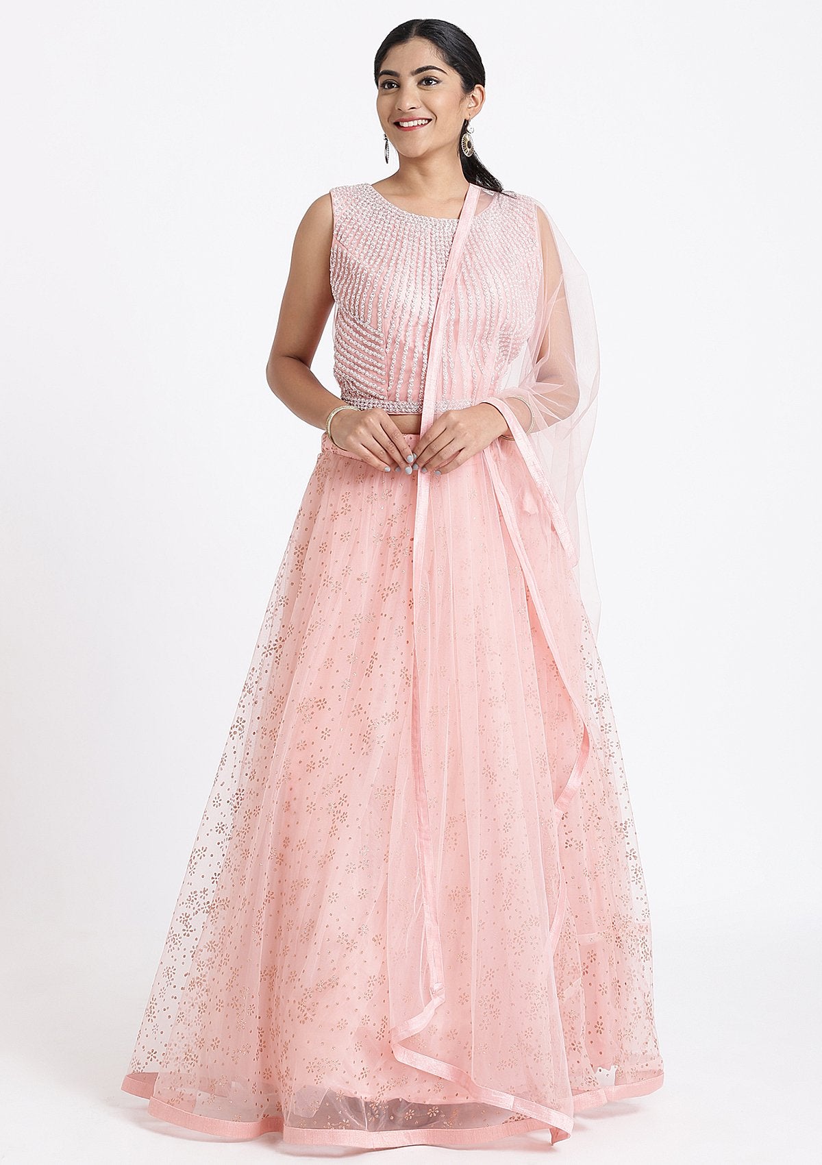 Pink Readymade Lehenga In Net. Embellished With Pearlwork Embroidery. Paired With A Blouse With Pearlwork Embroidery. Enhanced With A Pink Net Dupatta.