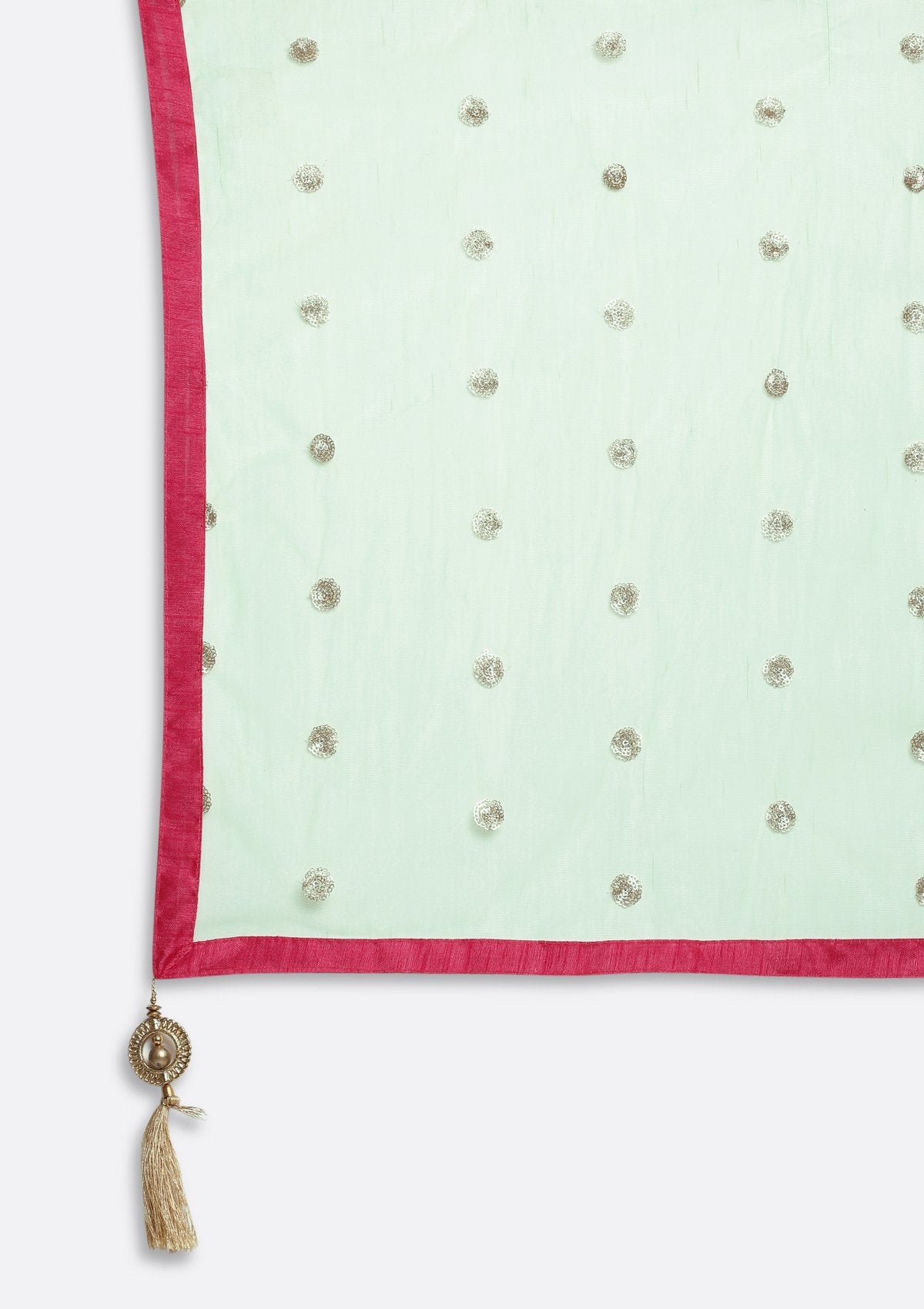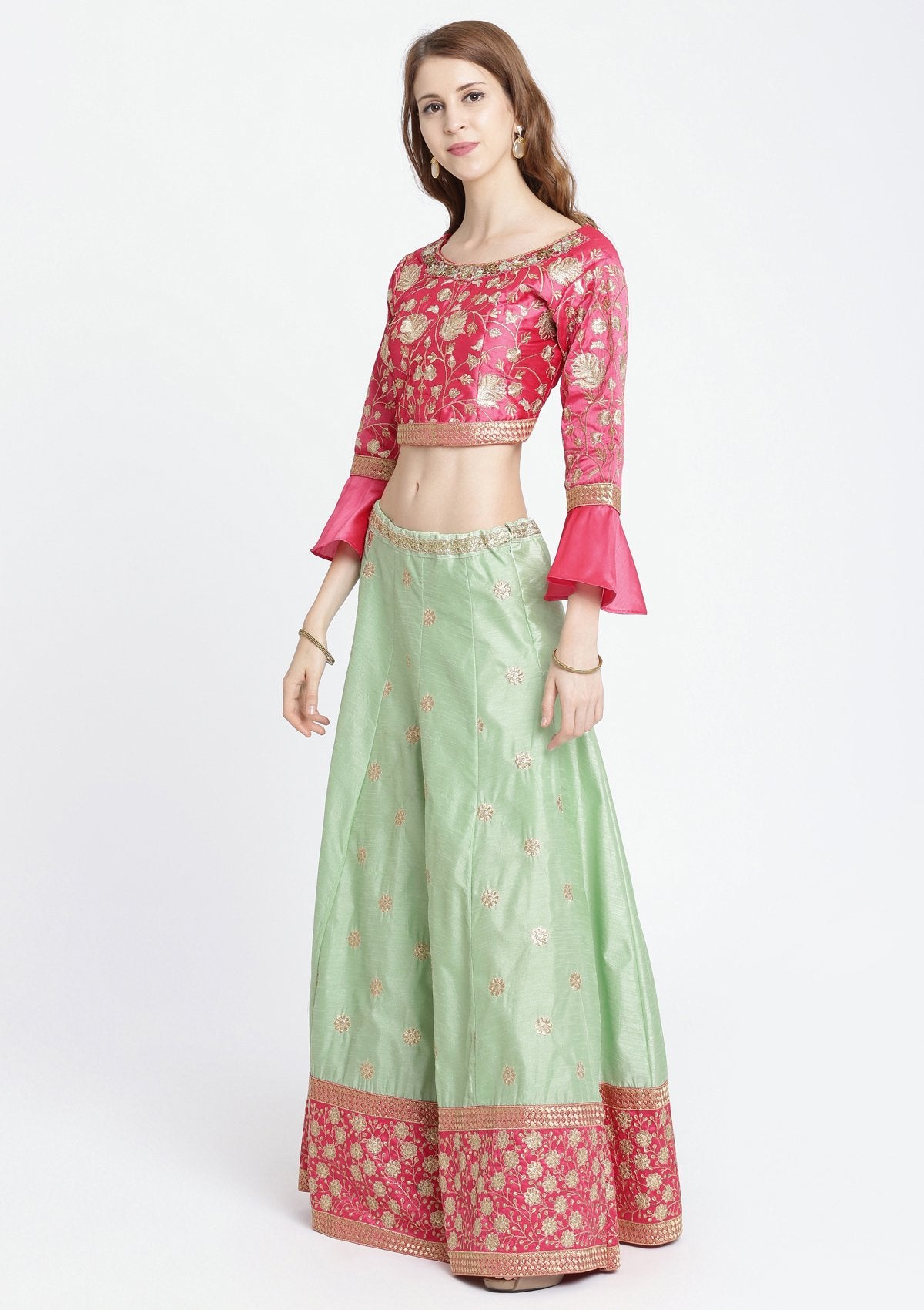 Pista Green Readymade Lehenga In Raw Silk. Embellished With Zariwork Embroidery. Paired With A Blouse With Zariwork Embroidery. Enhanced With A Pista Green Raw Silk Dupatta.
