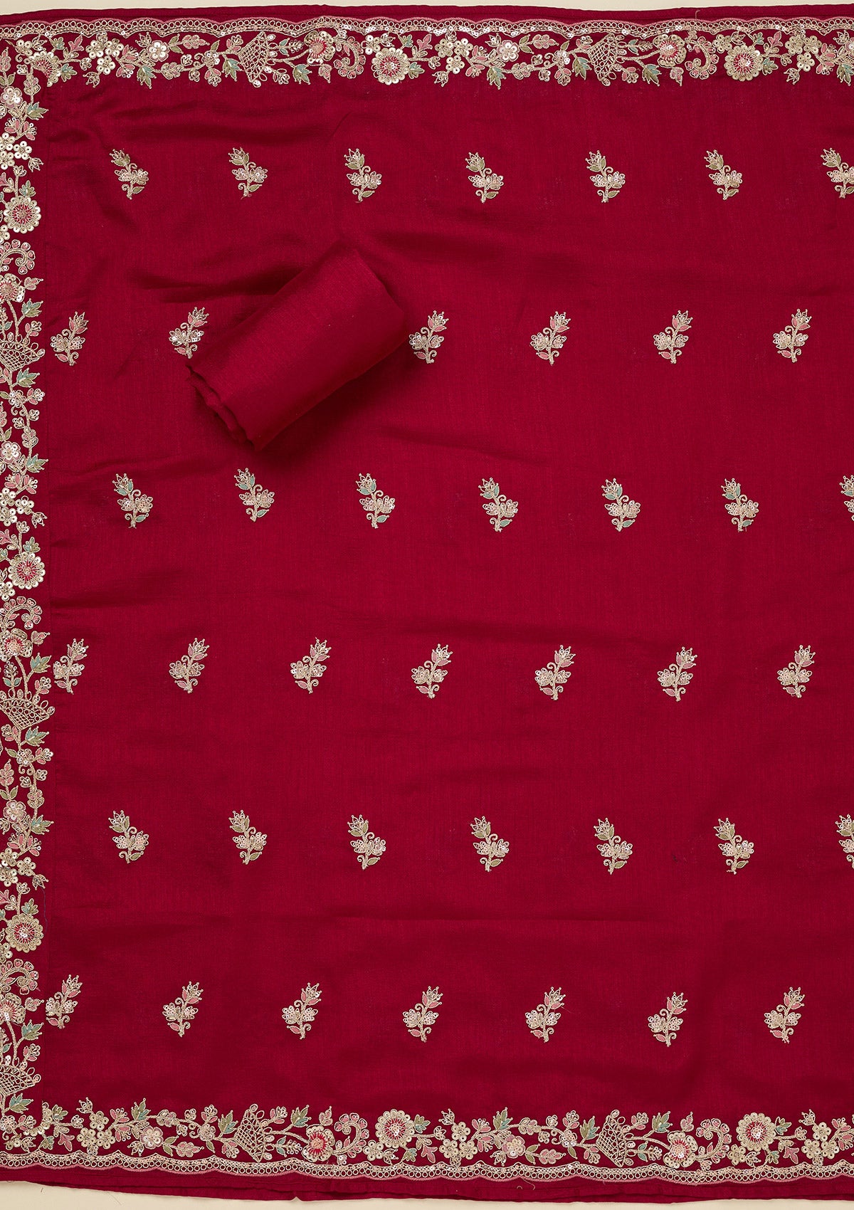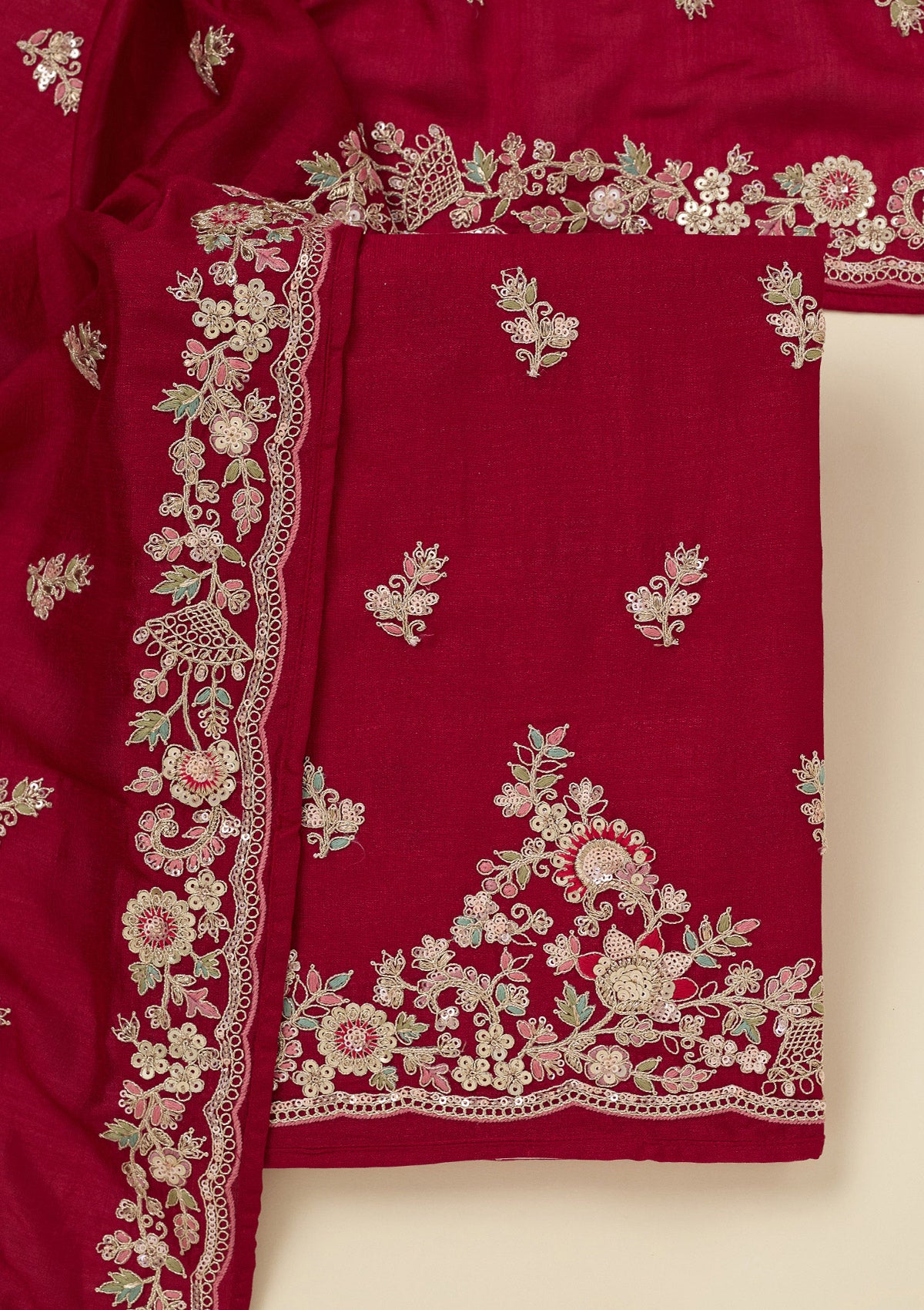 Rani Pink Zariwork (Gold) Soft Raw Silk Unstitched Salwar Suit