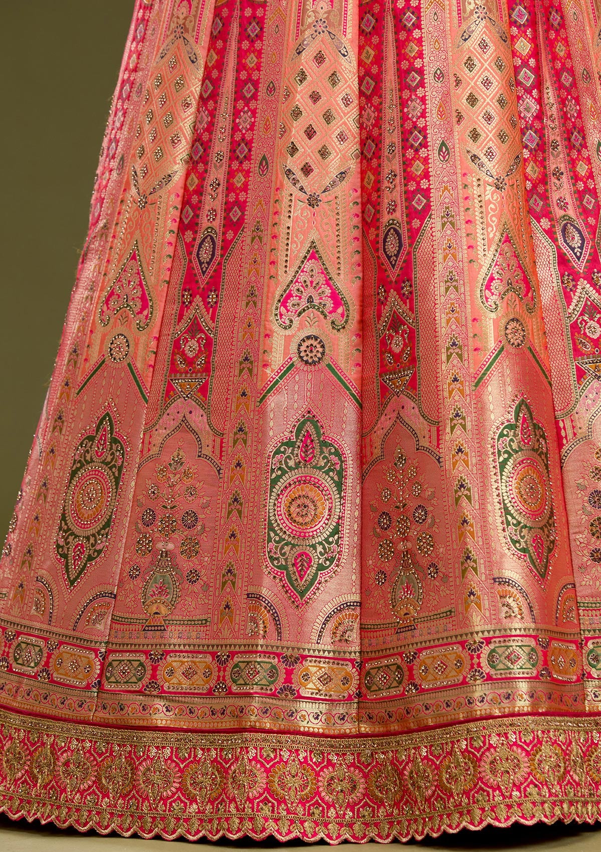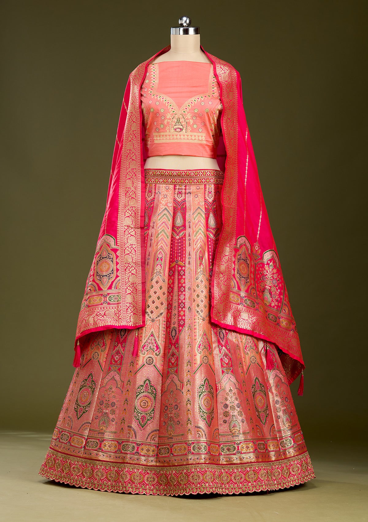 Peach Readymade Lehenga in Banarasi fabric. The Lehenga is embellished with Stonework embroidery. Accompanied with an Readymade blouse and dupatta. Comes with the Koskii promise of premium quality.