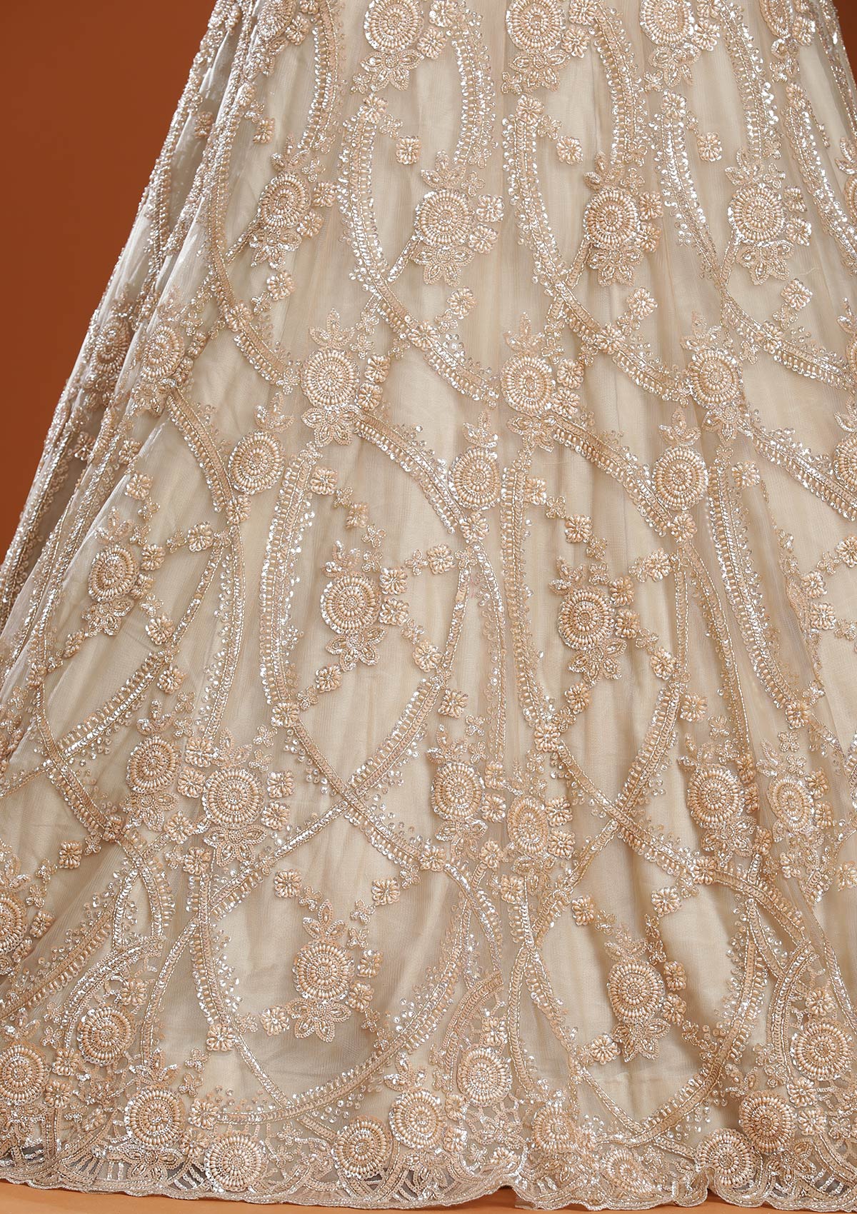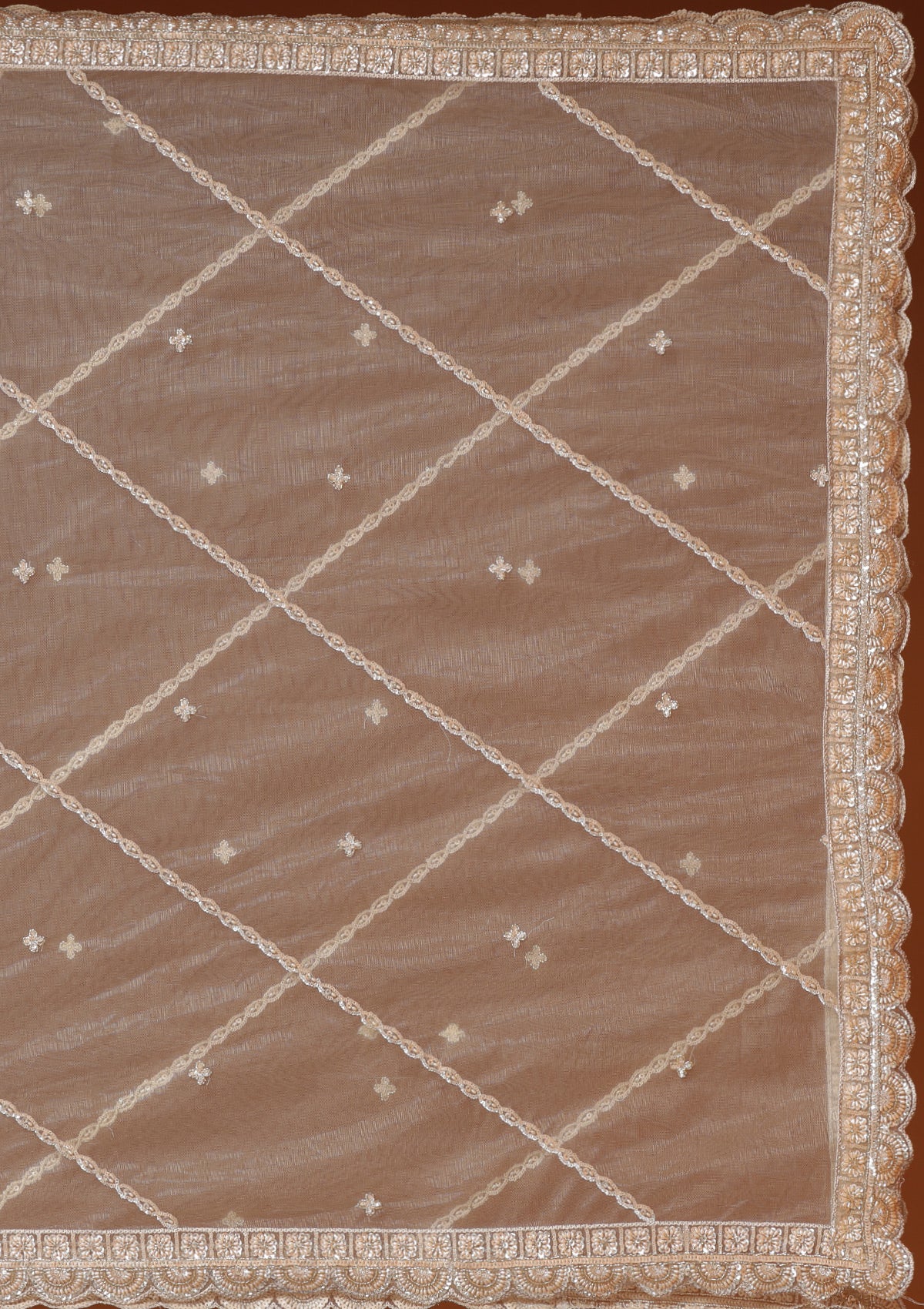Beige Readymade Lehenga in Net fabric. The Lehenga is embellished with Cutdana embroidery. Accompanied with an Readymade blouse and dupatta. Comes with the Koskii promise of premium quality.