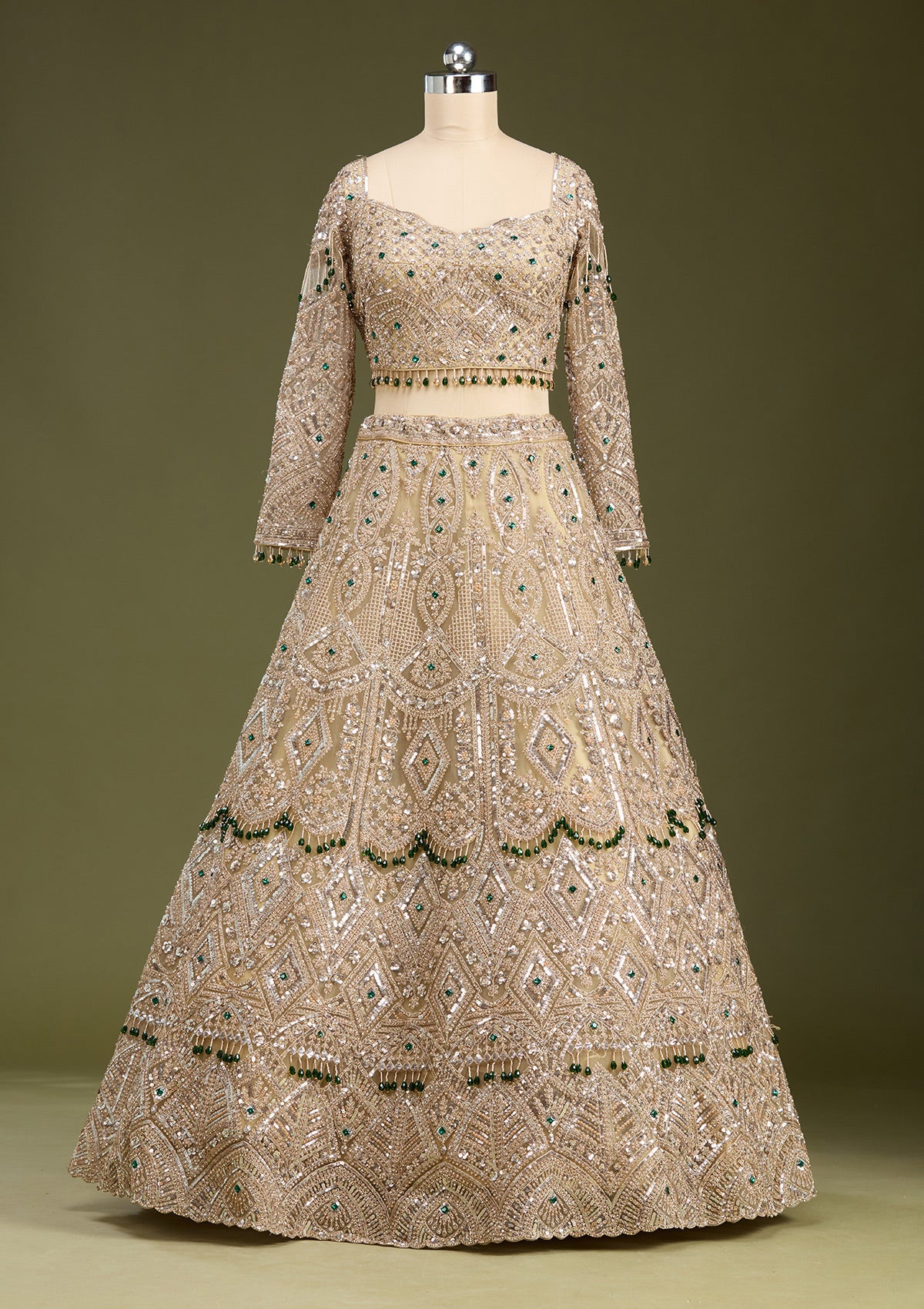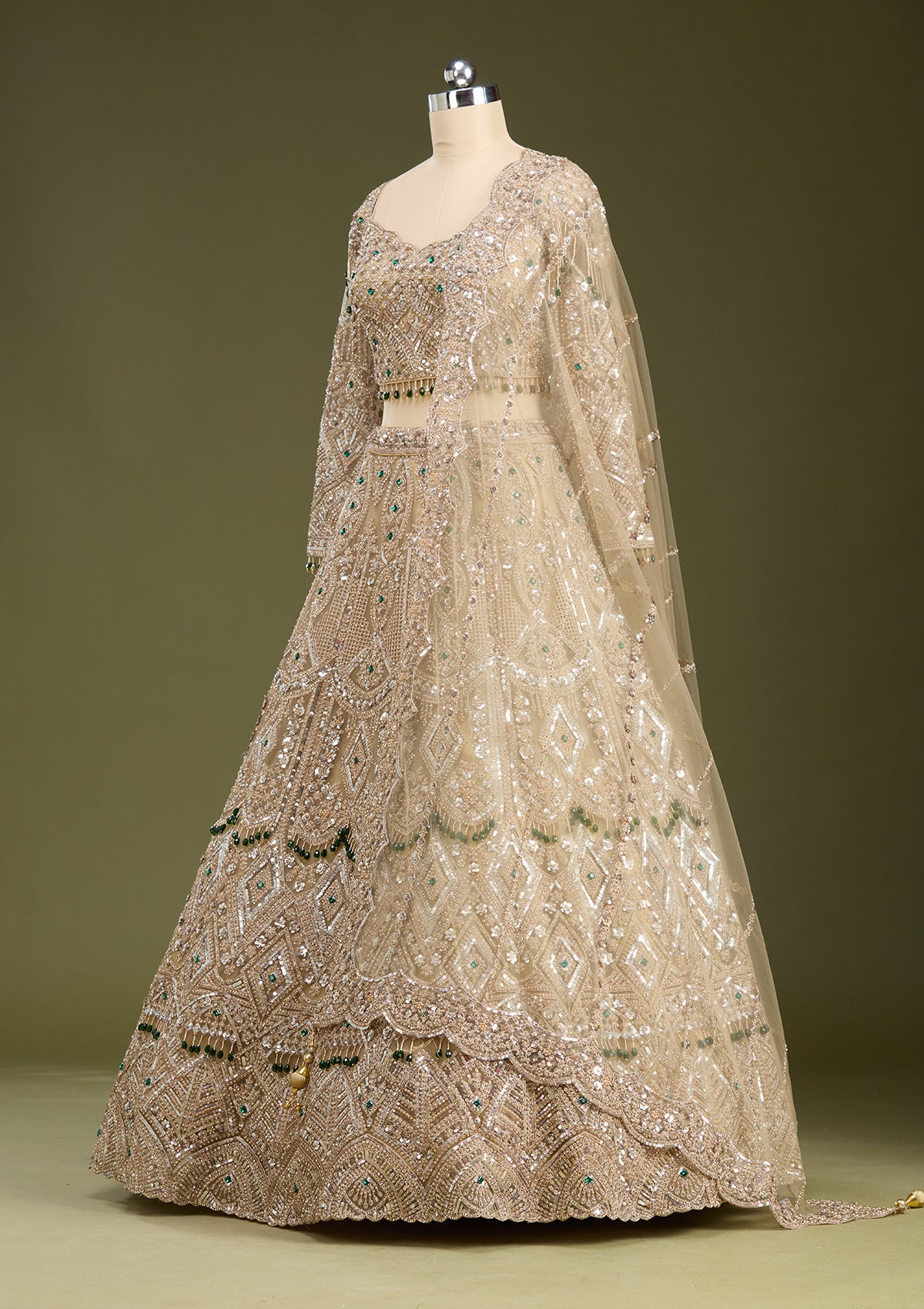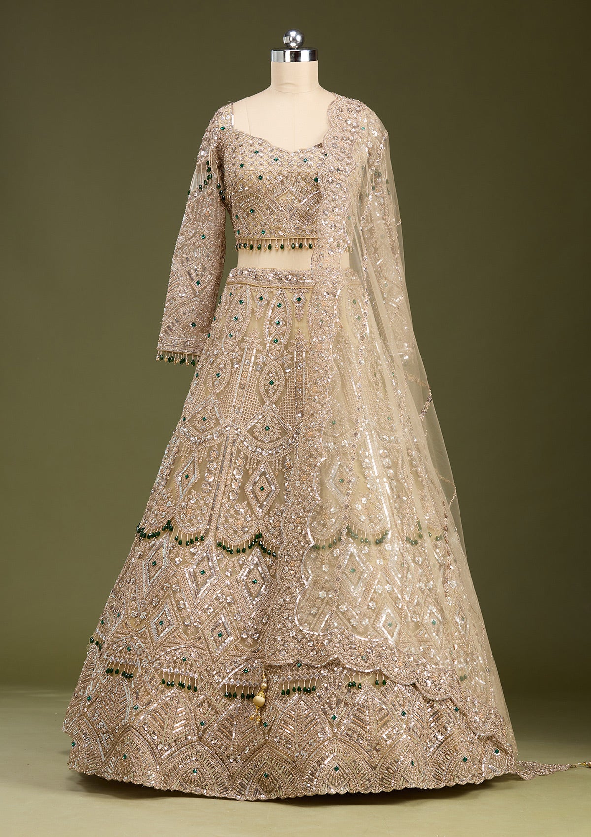 Beige Readymade Lehenga in Net fabric. The Lehenga is embellished with Sequins embroidery. Accompanied with an Readymade blouse and dupatta. Comes with the Koskii promise of premium quality.