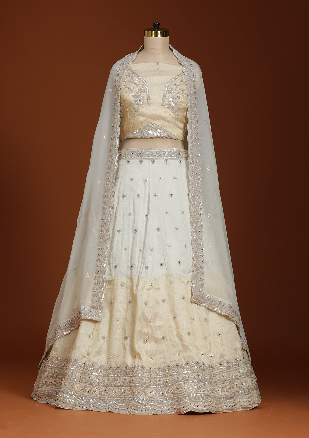 Cream Semi-Stitched Lehenga in Tissue fabric. The Lehenga is embellished with Cording embroidery. Accompanied with an Semi-Stitched blouse and dupatta. Comes with the Koskii promise of premium quality.