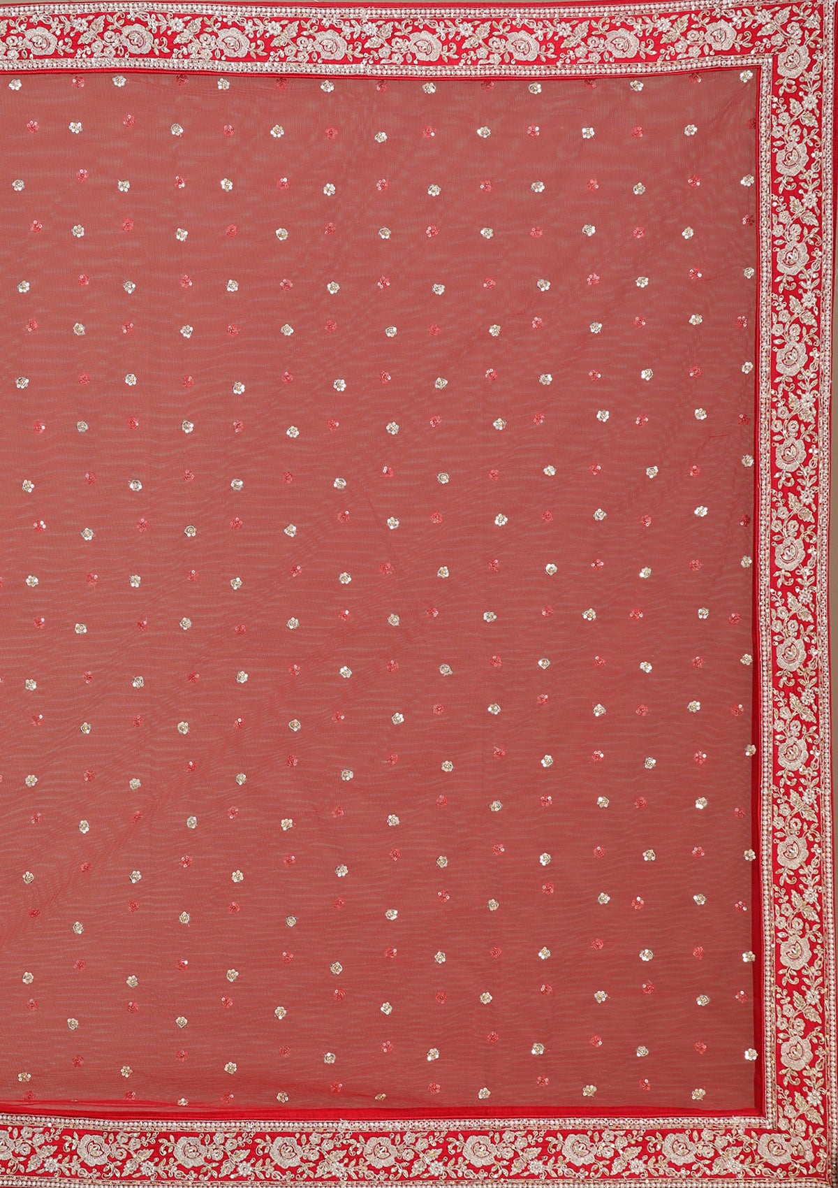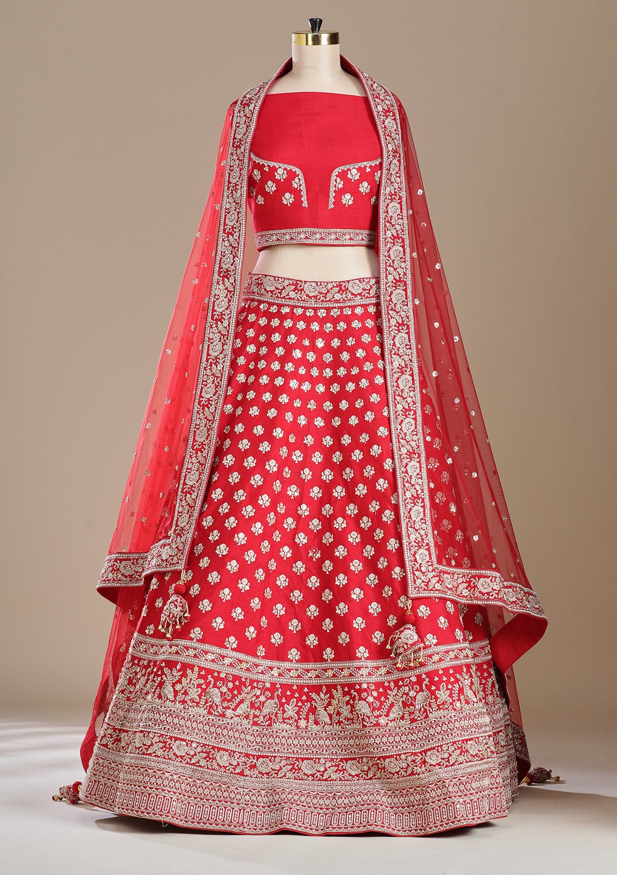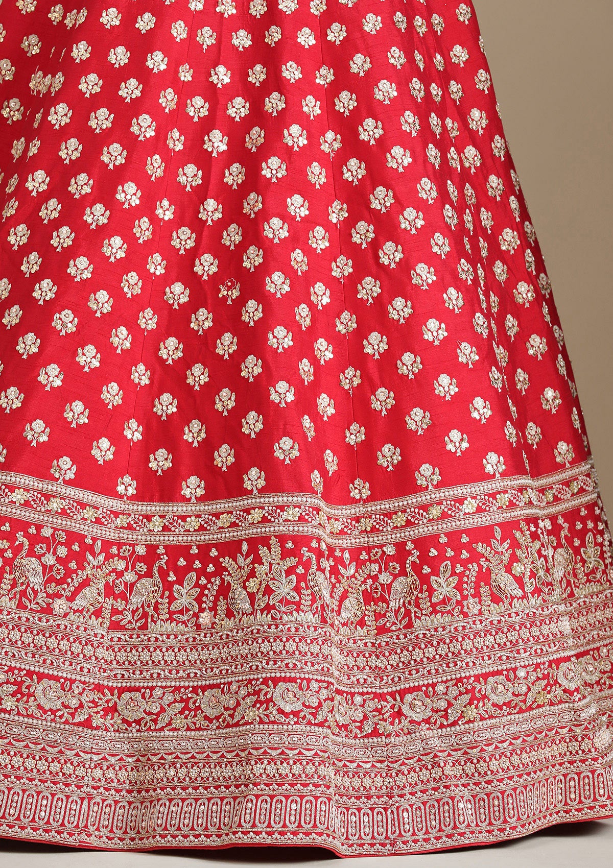 Maroon Readymade Lehenga in Raw Silk fabric. The Lehenga is embellished with Zardozi (Gold) embroidery. Accompanied with an Readymade blouse and dupatta. Comes with the Koskii promise of premium quality.
