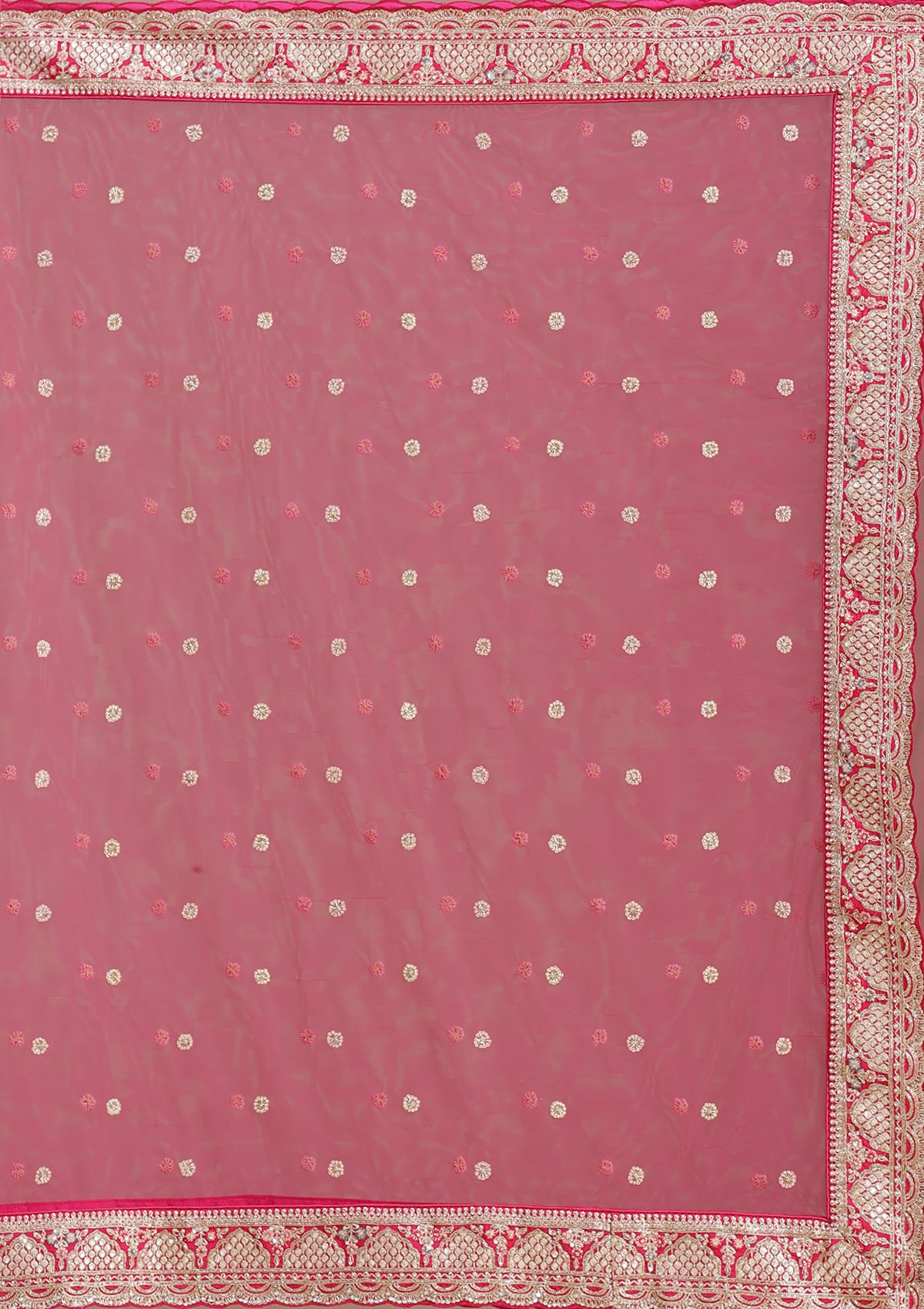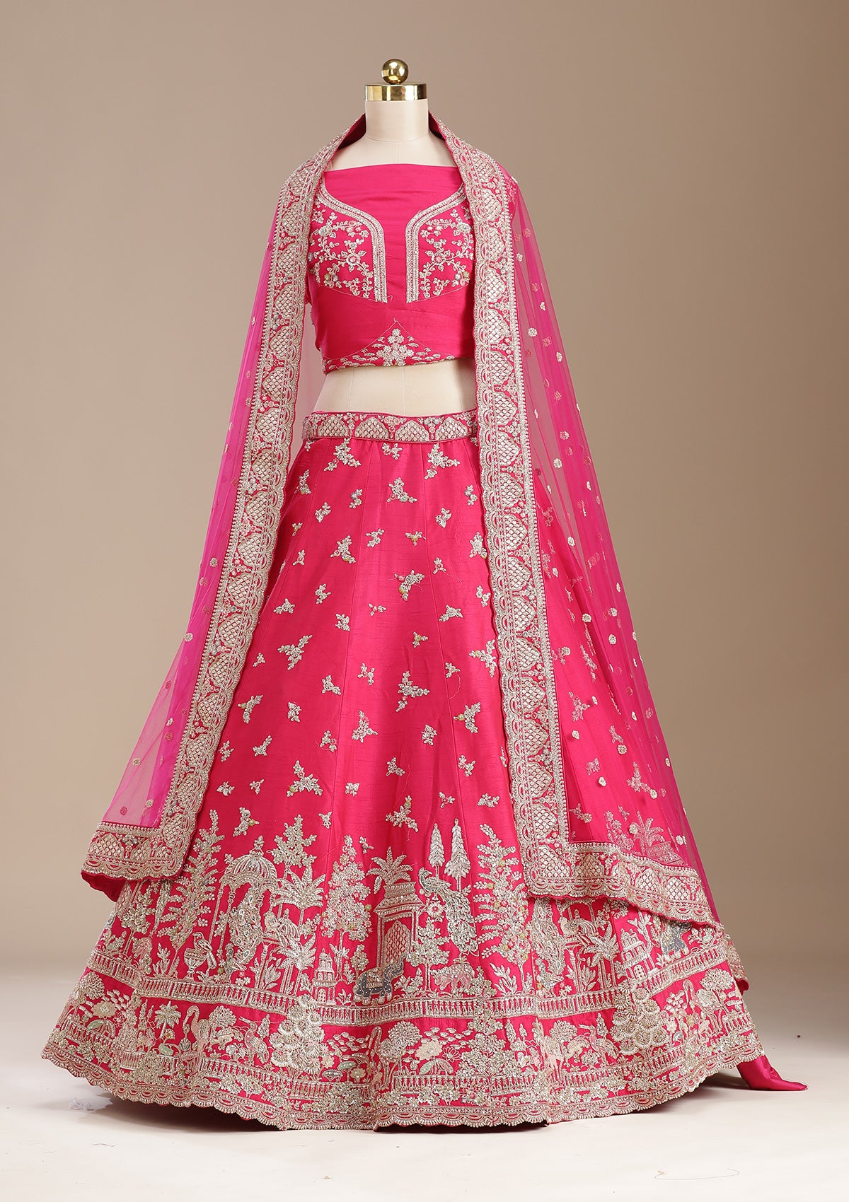 Rani Pink Semi-Stitched Lehenga in Raw Silk fabric. The Lehenga is embellished with Zardozi (Gold) embroidery. Accompanied with an Semi-Stitched blouse and dupatta. Comes with the Koskii promise of premium quality.