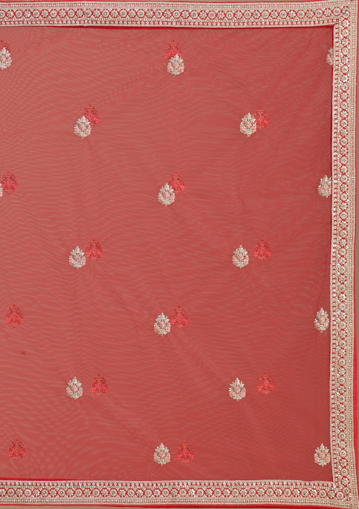 Red Semi-Stitched Lehenga in Net fabric. The Lehenga is embellished with Cording embroidery. Accompanied with an Semi-Stitched blouse and dupatta. Comes with the Koskii promise of premium quality.