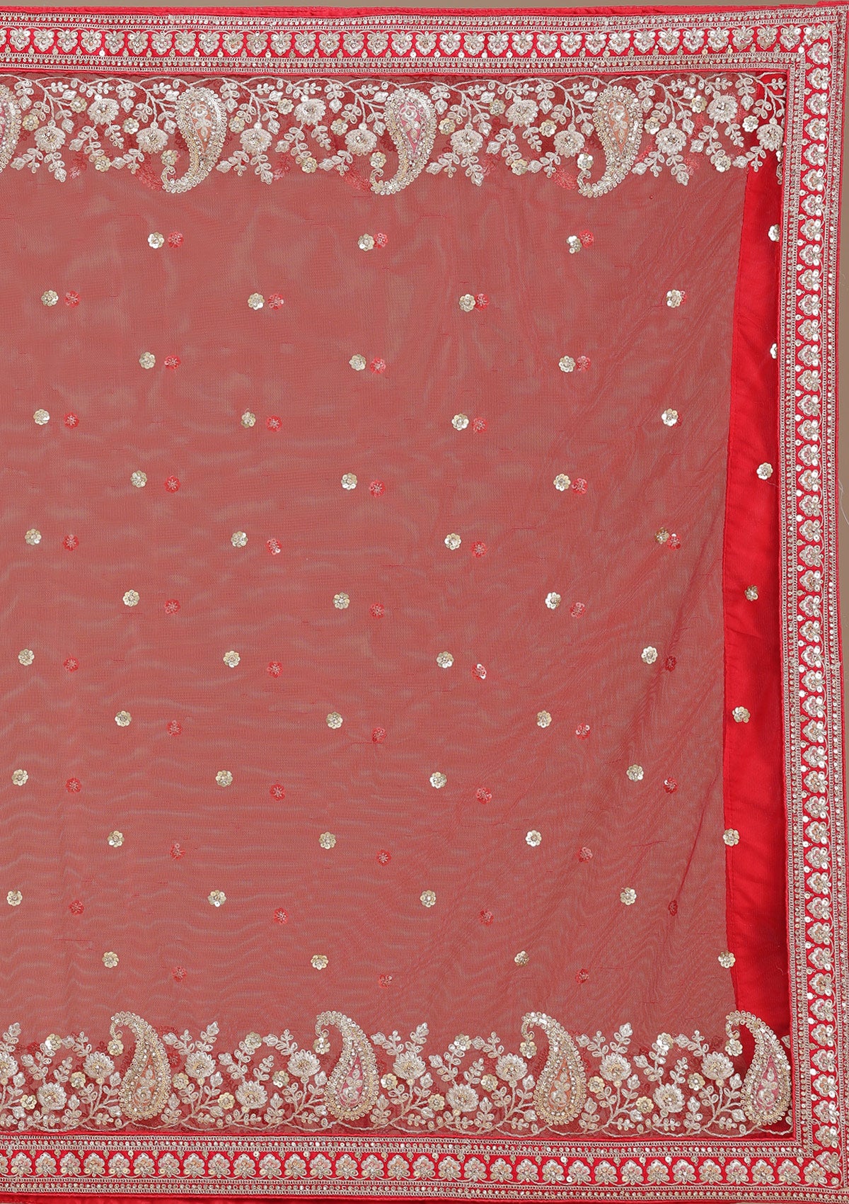 Red Semi-Stitched Lehenga in Raw Silk fabric. The Lehenga is embellished with Cording embroidery. Accompanied with an Semi-Stitched blouse and dupatta. Comes with the Koskii promise of premium quality.