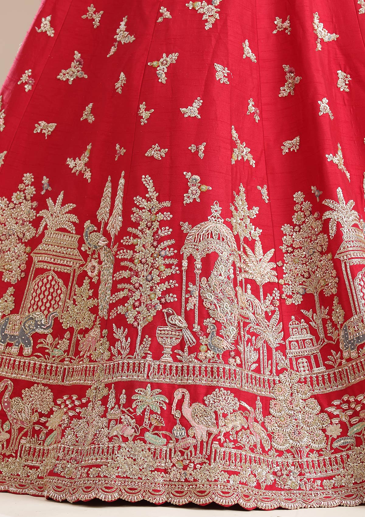 Red Zardozi (Gold) Raw Silk Semi-Stitched Lehenga