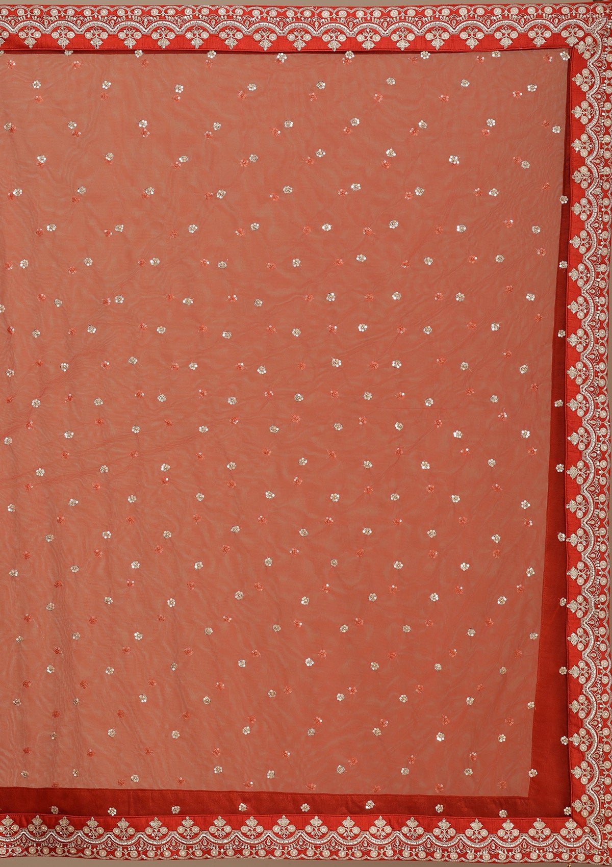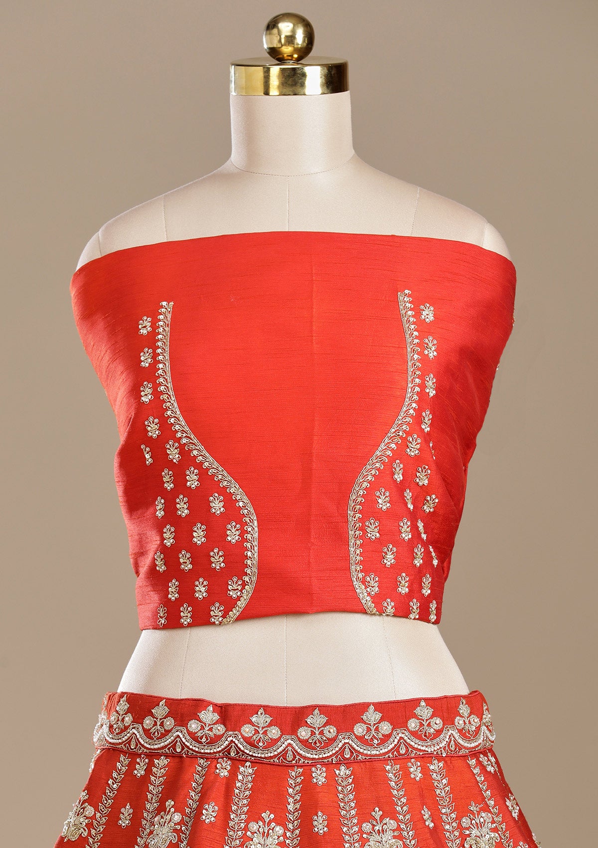 Rust Semi-Stitched Lehenga in Raw Silk fabric. The Lehenga is embellished with Zardozi (Gold) embroidery. Accompanied with an Semi-Stitched blouse and dupatta. Comes with the Koskii promise of premium quality.