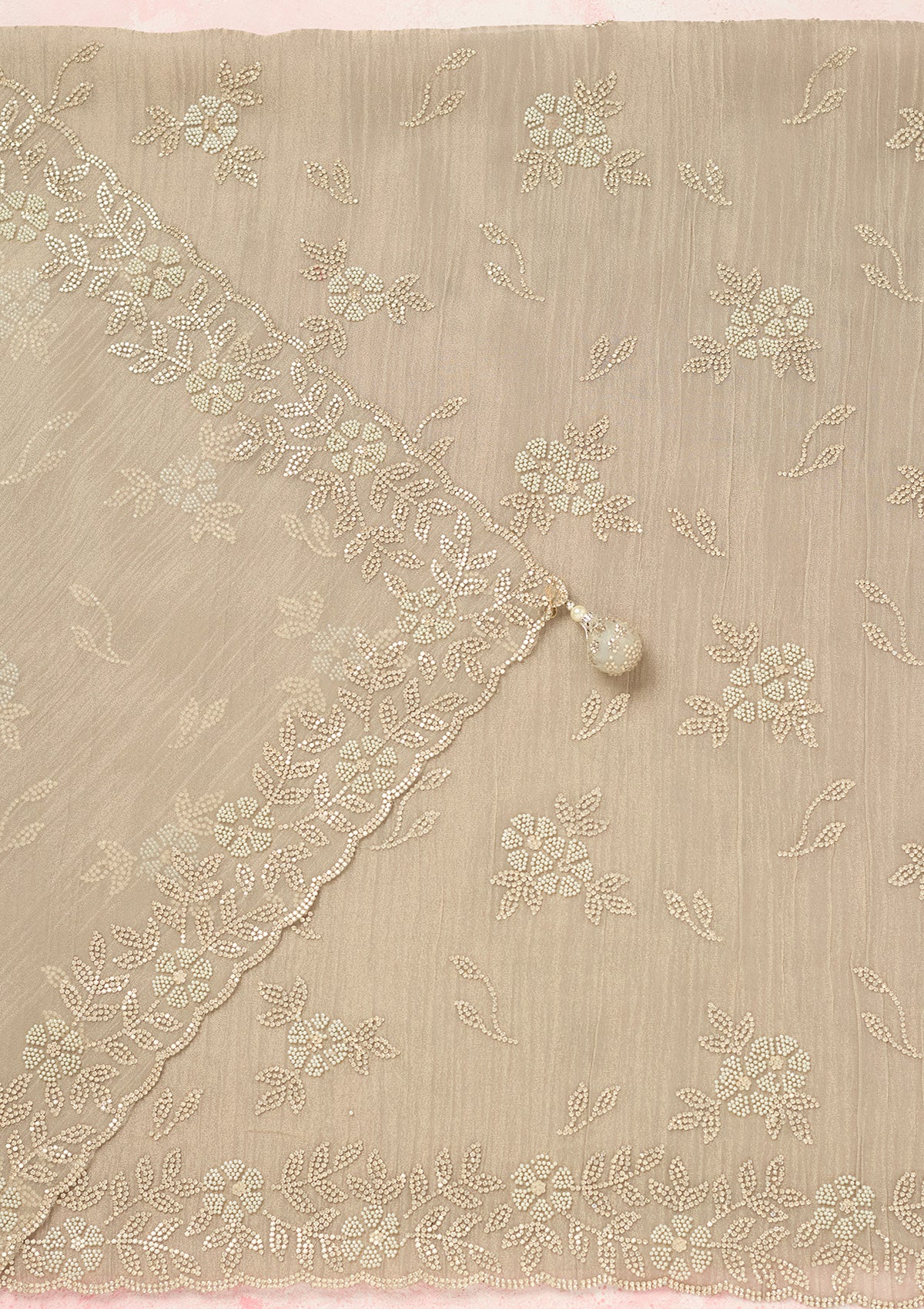 Light Grey Salwar Suit in Tissue fabric. The Salwar Suit is embellished with Zardozi (Gold) embroidery. Accompanied with a bottom and dupatta. Comes with the Koskii promise of premium quality.