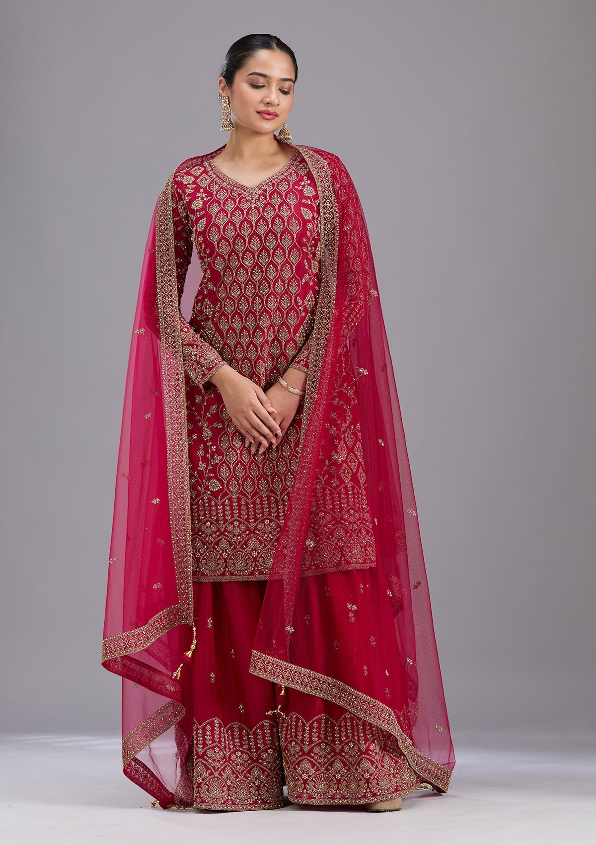 Maroon Salwar Suit in Georgette fabric The Salwar Suit is embellished with Stonework (Gold) embroidery Accompanied with a bottom and dupatta Comes with the Koskii promise of premium quality.