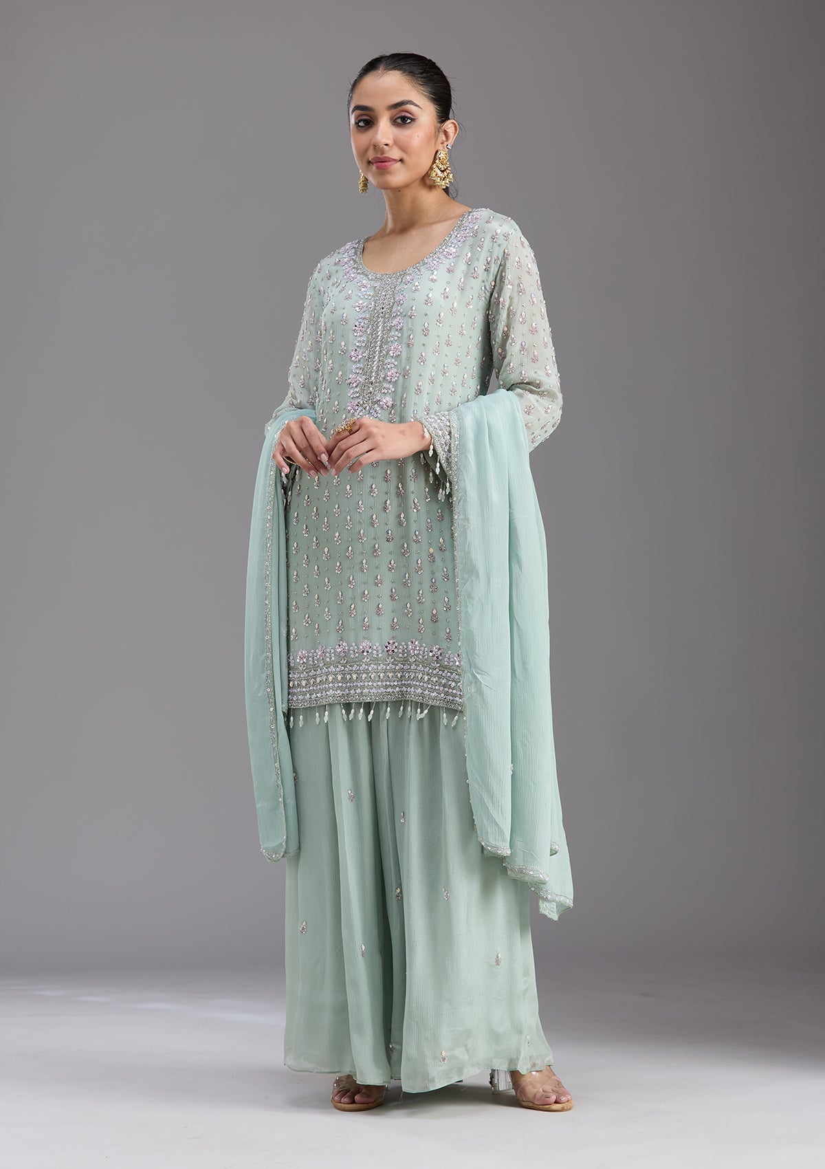 Sea Green Salwar Suit in Tissue fabric The Salwar Suit is embellished with Mirrorwork embroidery Accompanied with a bottom and dupatta Comes with the Koskii promise of premium quality.
