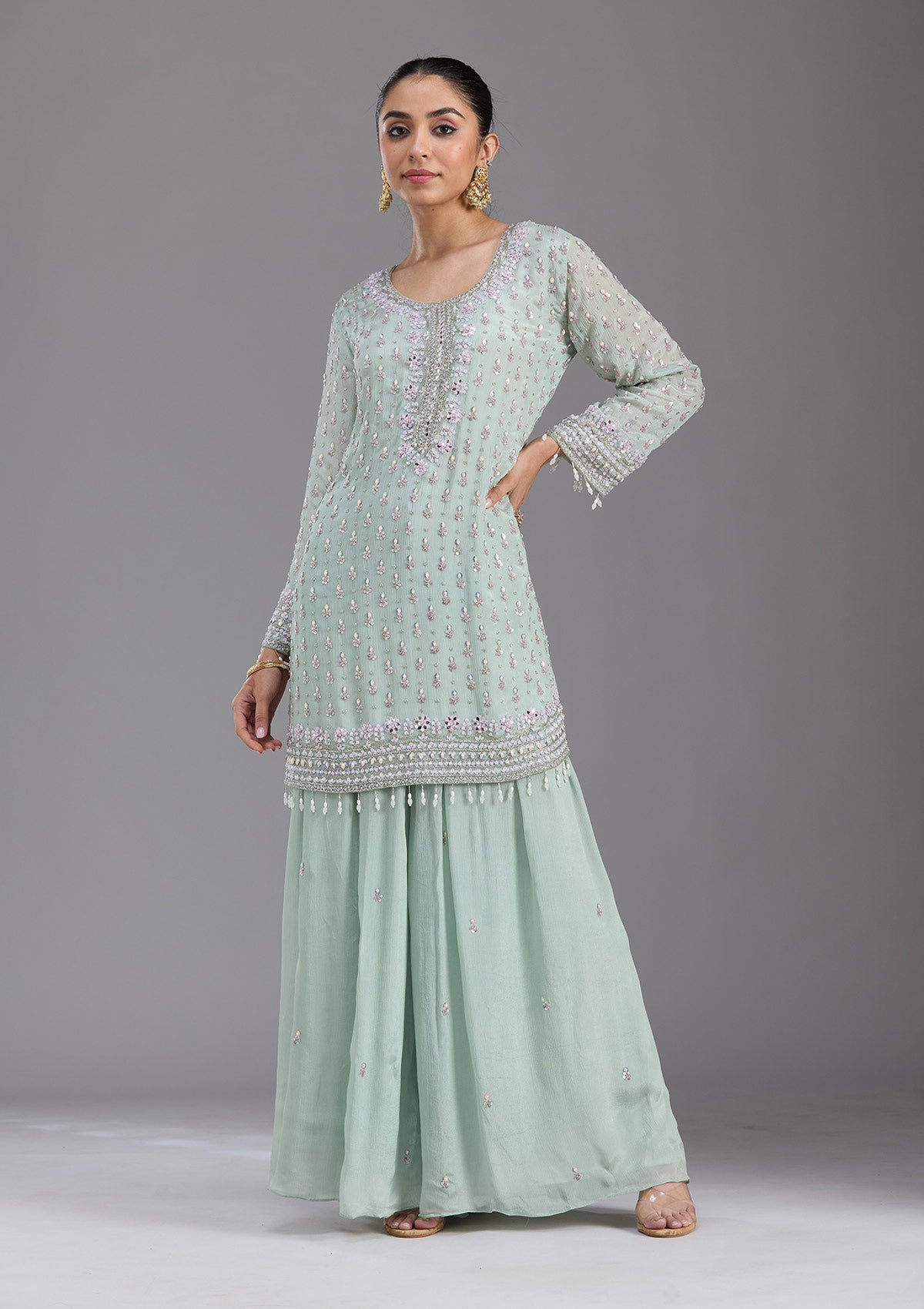 Sea Green Mirrorwork Tissue Readymade Salwar Suit
