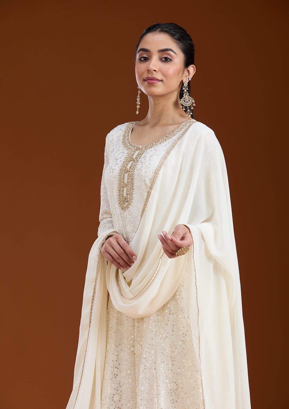 White Salwar Suit in Georgette fabric. The Salwar Suit is embellished with Sequins embroidery. Accompanied with a bottom and dupatta. Comes with the Koskii promise of premium quality.
