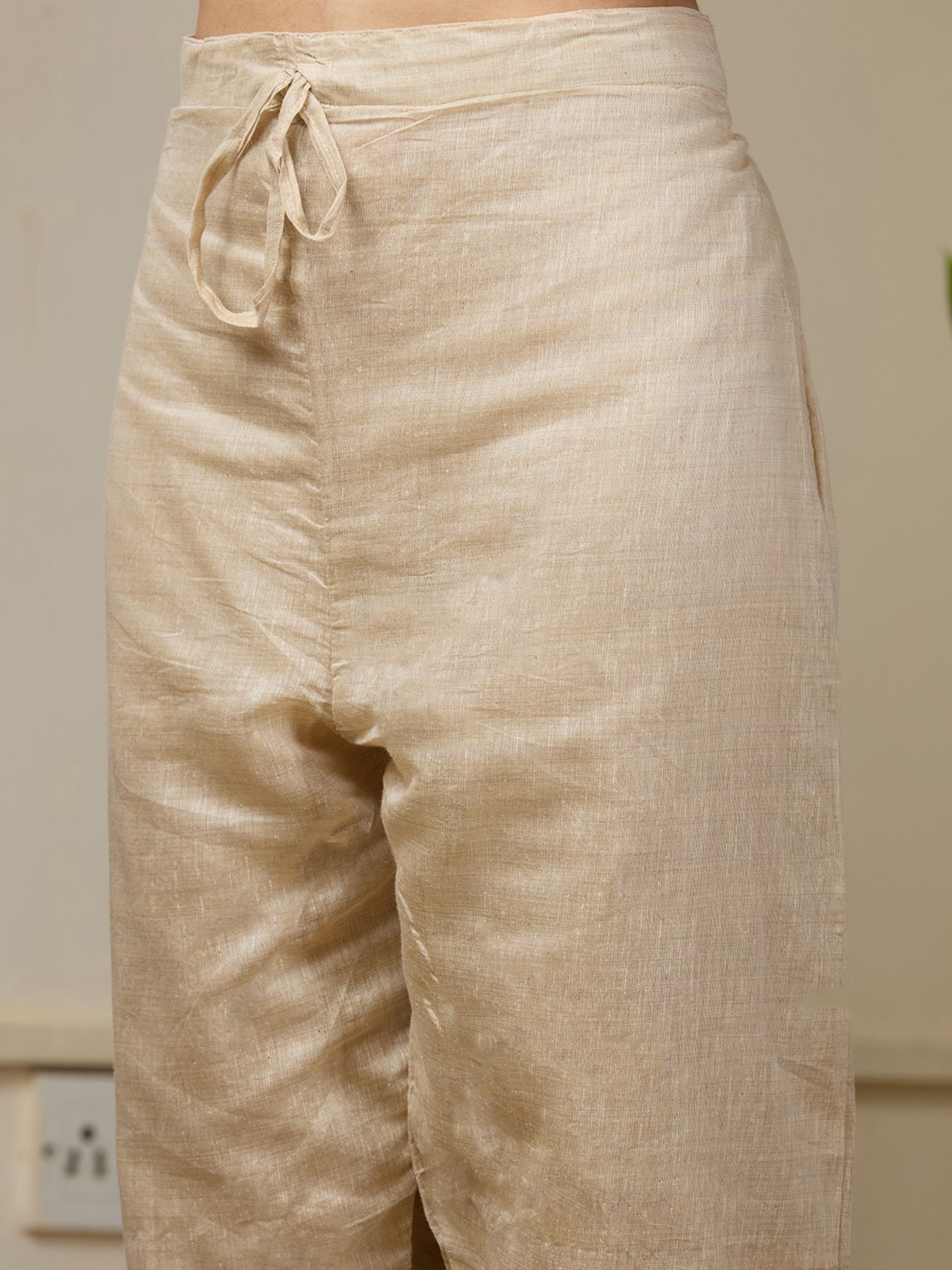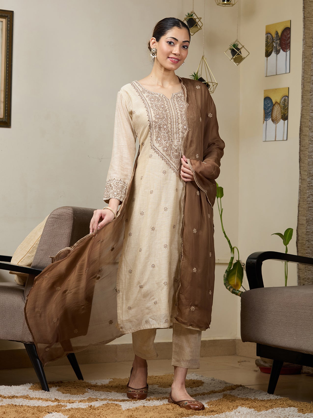 Beige Salwar Suit in Chanderi fabric. The Salwar Suit is embellished with Threadwork embroidery. Accompanied with a bottom and dupatta. Comes with the Koskii promise of premium quality.