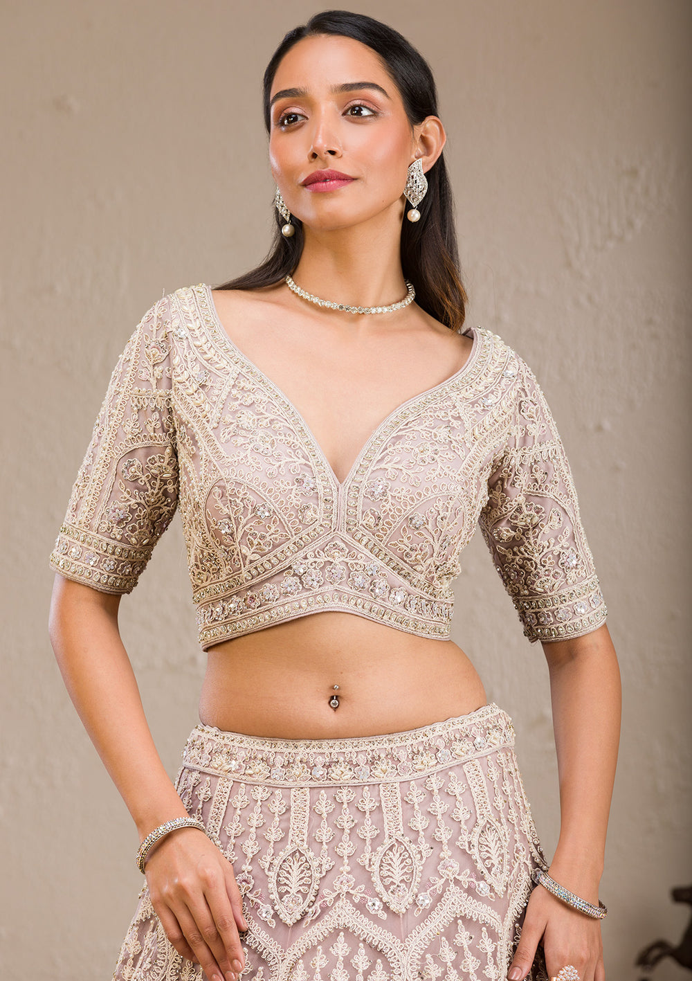 Twirl into the spotlight with Koskii's Ivory Net Lehenga, where every stitch tells a story of elegance and every pearl echoes luxury. This unstitched lehenga dazzles with intricate pearlwork embroidery, promising not just an outfit but an experience wrapped in net’s ethereal charm. Perfect for those who craft their style narratives with a blend of tradition and personal flair, it's not just a garment; it's your canvas to creativity!.
