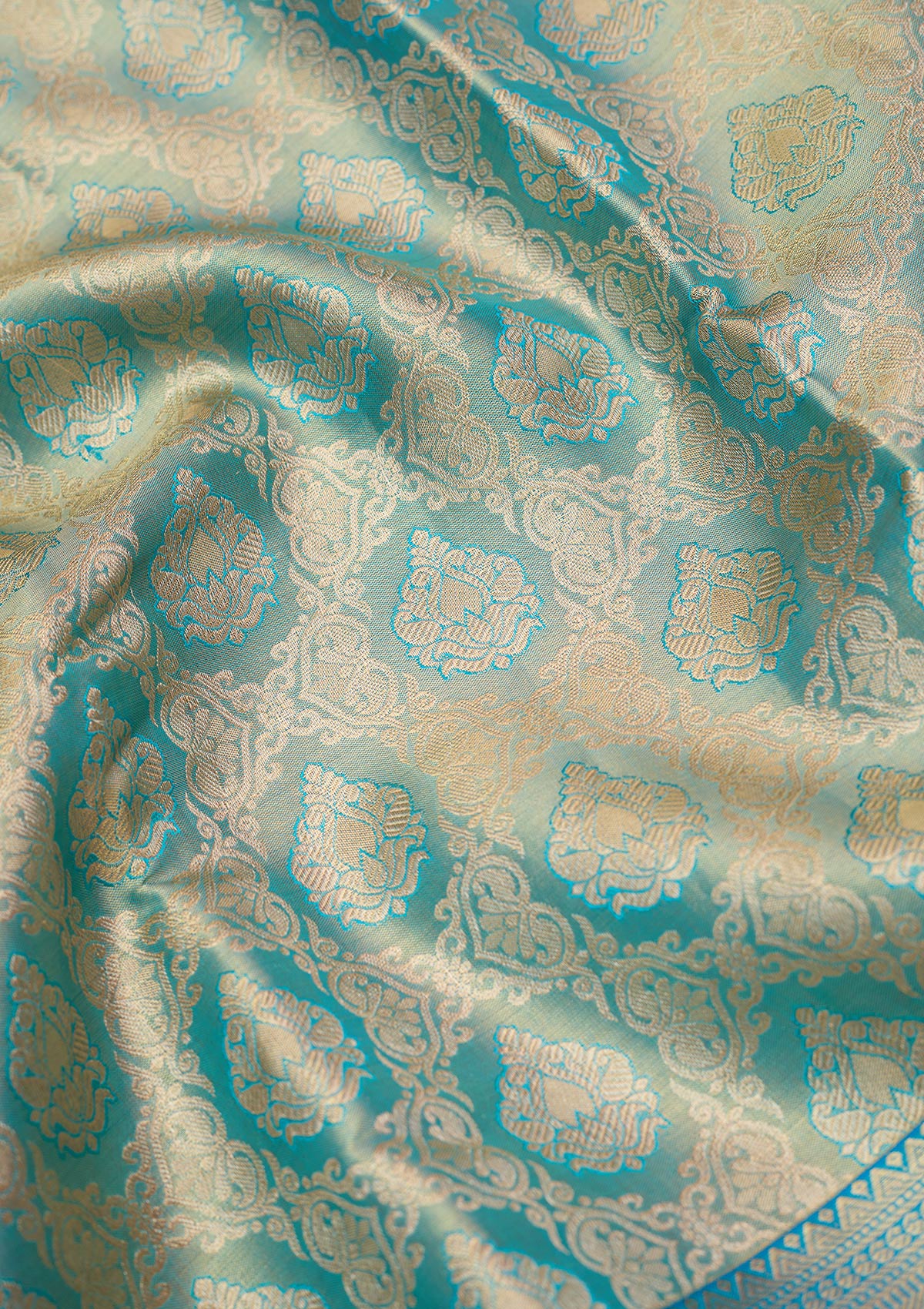 Blue Silk_Saree in Silk fabric. The Silk_Saree is elevated with Zariwork (Gold) embroidery. It comes with an Unstitched blouse. Comes with the Koskii promise of premium quality.