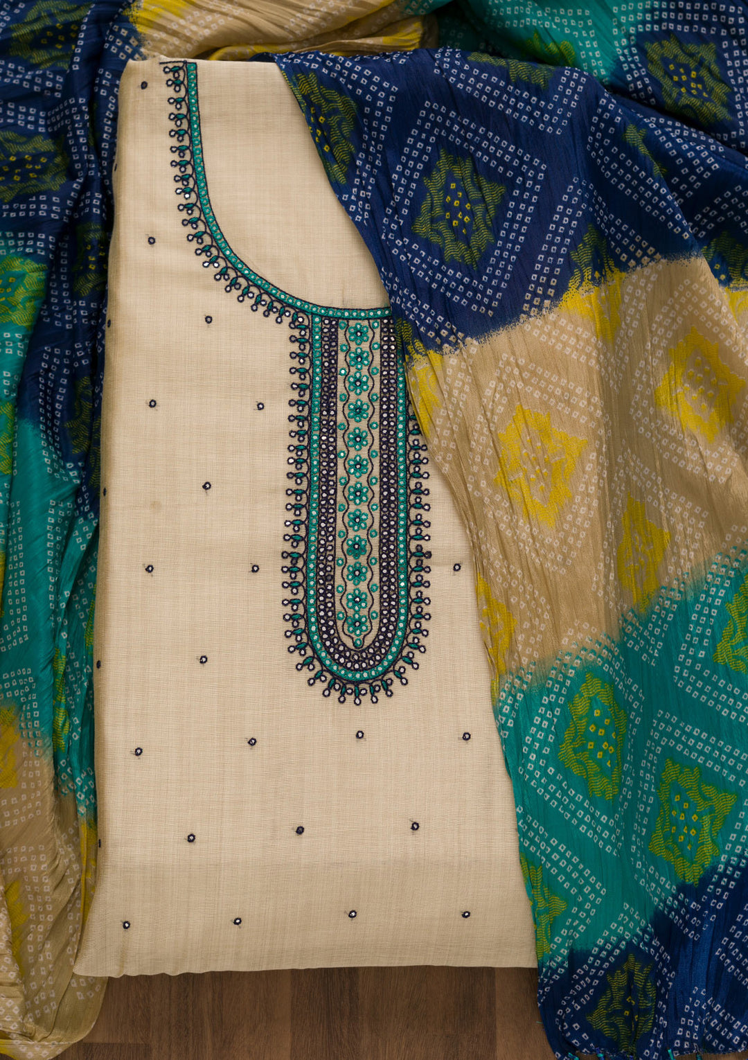 Cream Threadwork Chanderi Unstitched Salwar Suit