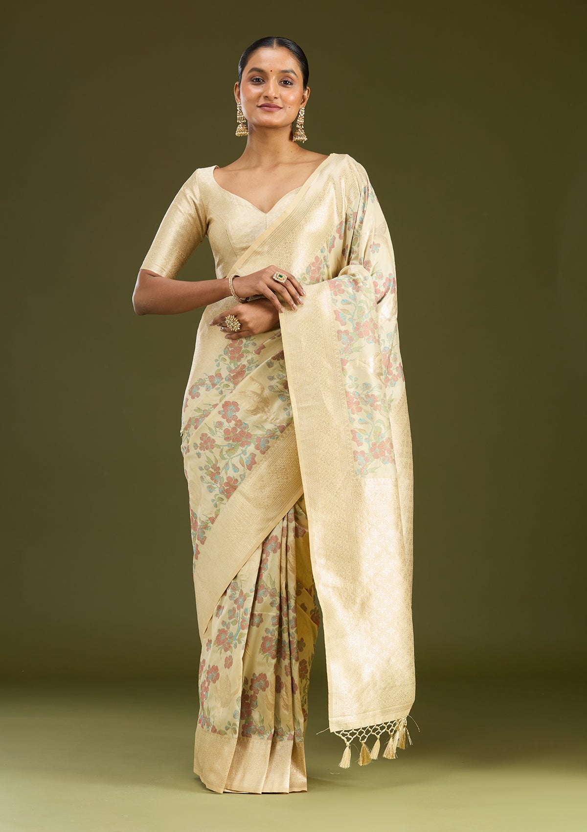 Cream Silk_Saree in Art Silk fabric. The Silk_Saree is elevated with Zariwork (Silver) embroidery. It comes with an Unstitched blouse. Comes with the Koskii promise of premium quality.