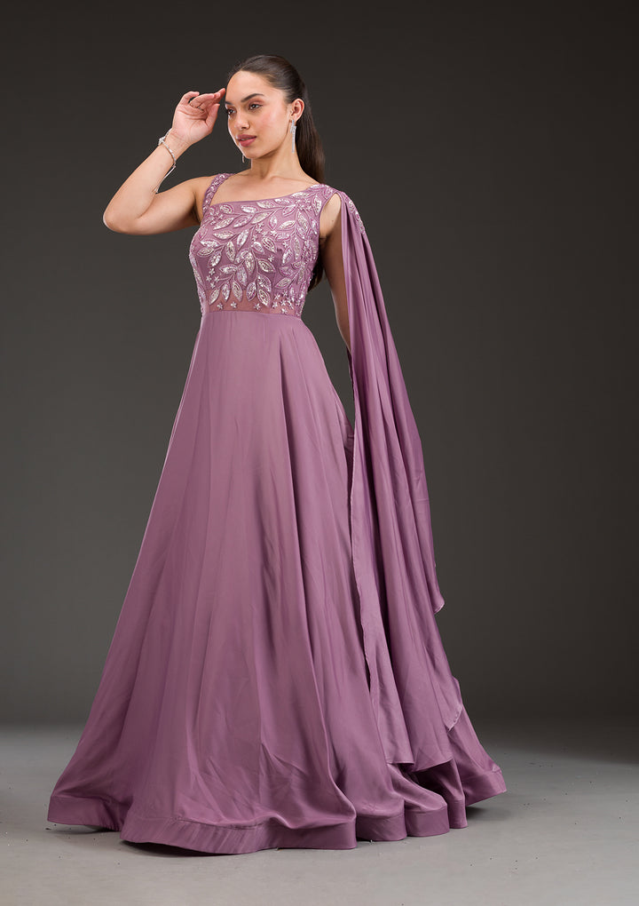 Dive into a world of enchantment with Koskii's Satin Lilac Gown, where every swirl twinkles with radiant stonework on sumptuous satin fabric. This stunning creation boasts a flirtatiously playful cape to add a dash of drama to your evening escapades. Perfect for those who love to express their vibrant personality through their wardrobe, this gown is a testament to limitless charm and elegance.