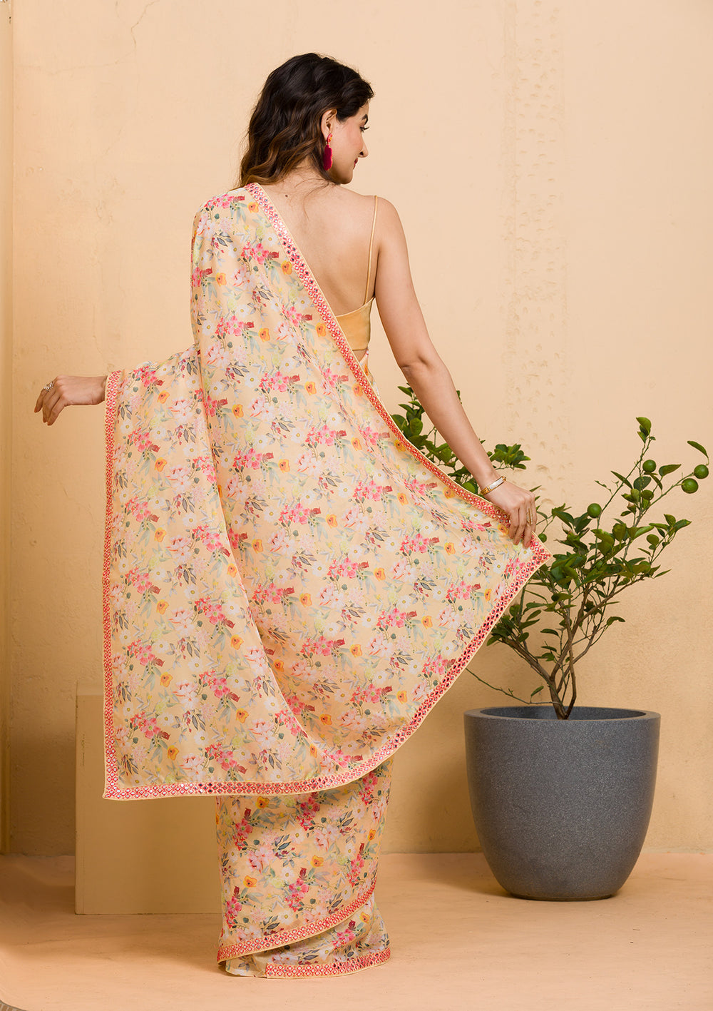 Lemon Yellow Saree in Organza fabric The Saree is elevated with Floral Prints It comes with an Unstitched blouse Comes with the Koskii promise of premium quality.