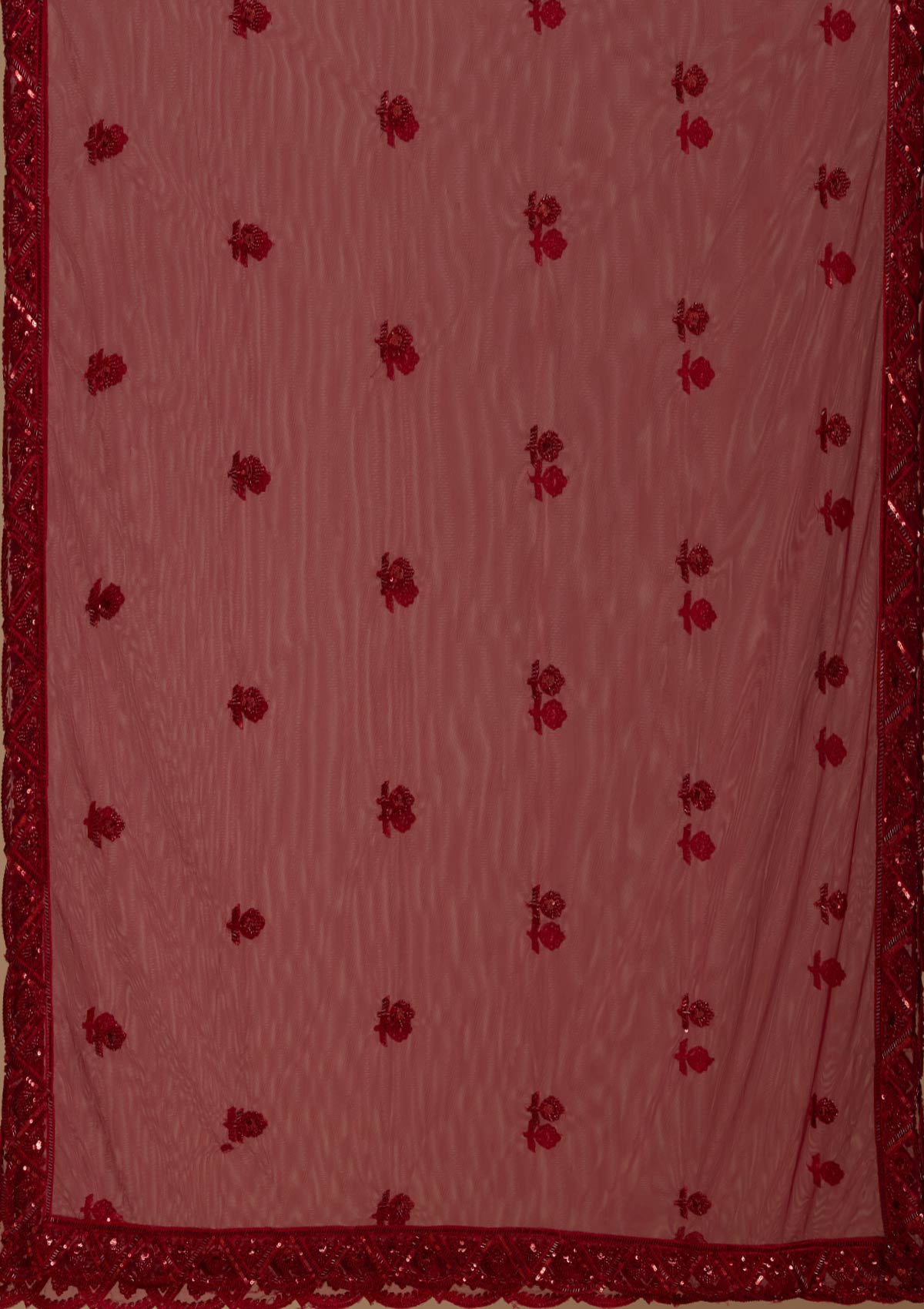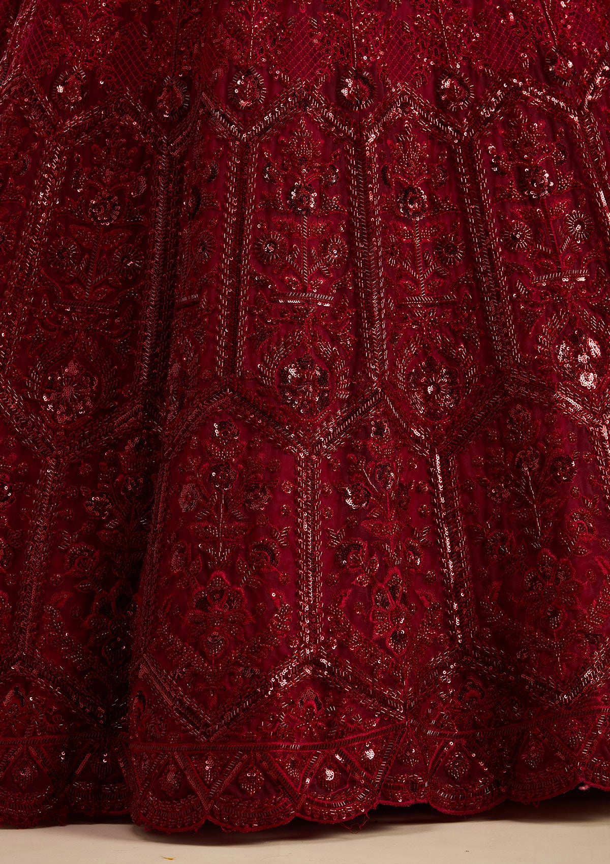 Maroon Readymade Lehenga in Net fabric. The Lehenga is embellished with Cutdana embroidery. Accompanied with an Readymade blouse and dupatta. Comes with the Koskii promise of premium quality.