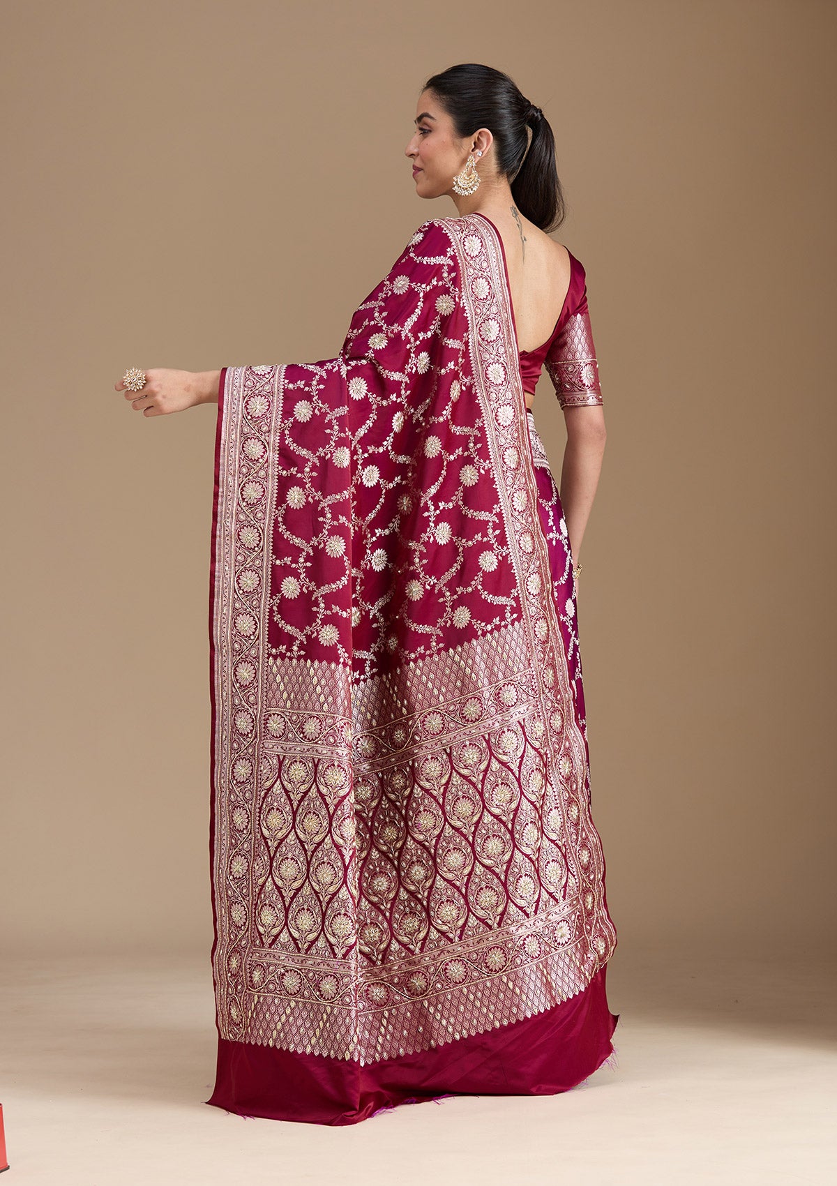 Maroon Silk_Saree in Art Silk fabric. The Silk_Saree is elevated with Zardozi (Silver) embroidery. It comes with an Unstitched blouse. Comes with the Koskii promise of premium quality.