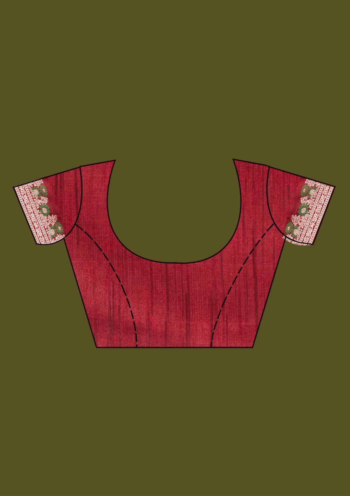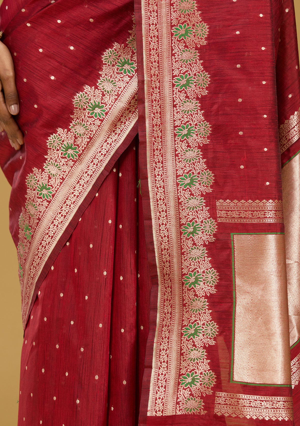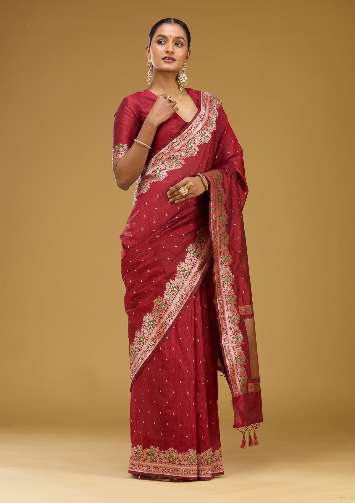 Maroon Silk_Saree in Art Silk fabric. The Silk_Saree is elevated with Zariwork (Gold) embroidery. It comes with an Unstitched blouse. Comes with the Koskii promise of premium quality.