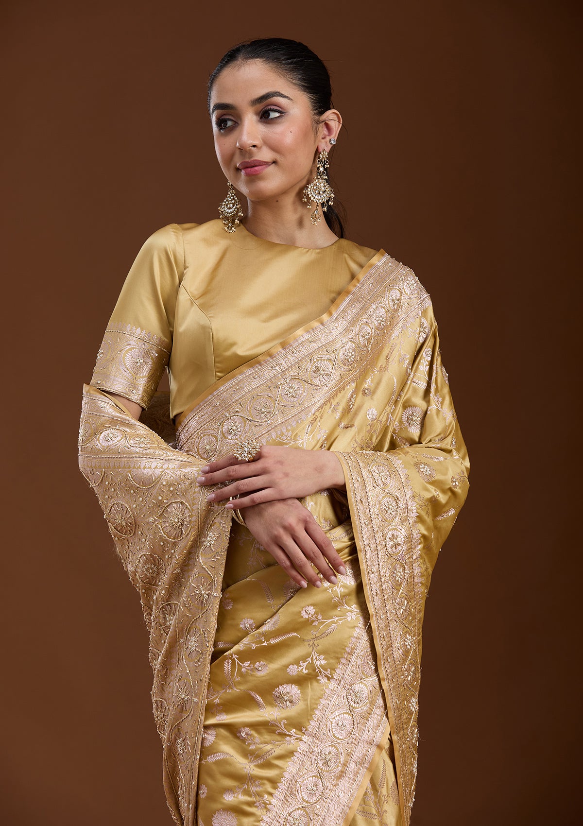 Mehendi Silk_Saree in Art Silk fabric. The Silk_Saree is elevated with Zardozi (Silver) embroidery. It comes with an Unstitched blouse. Comes with the Koskii promise of premium quality.