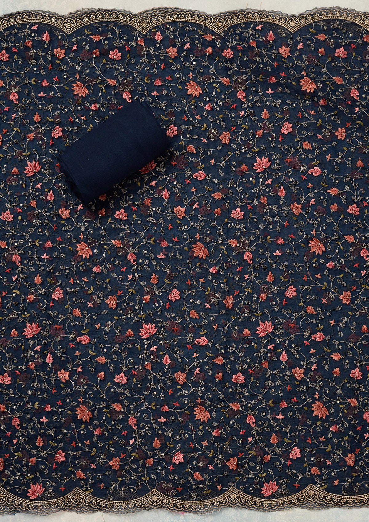 Navy Blue Threadwork Tissue Unstitched Salwar Suit