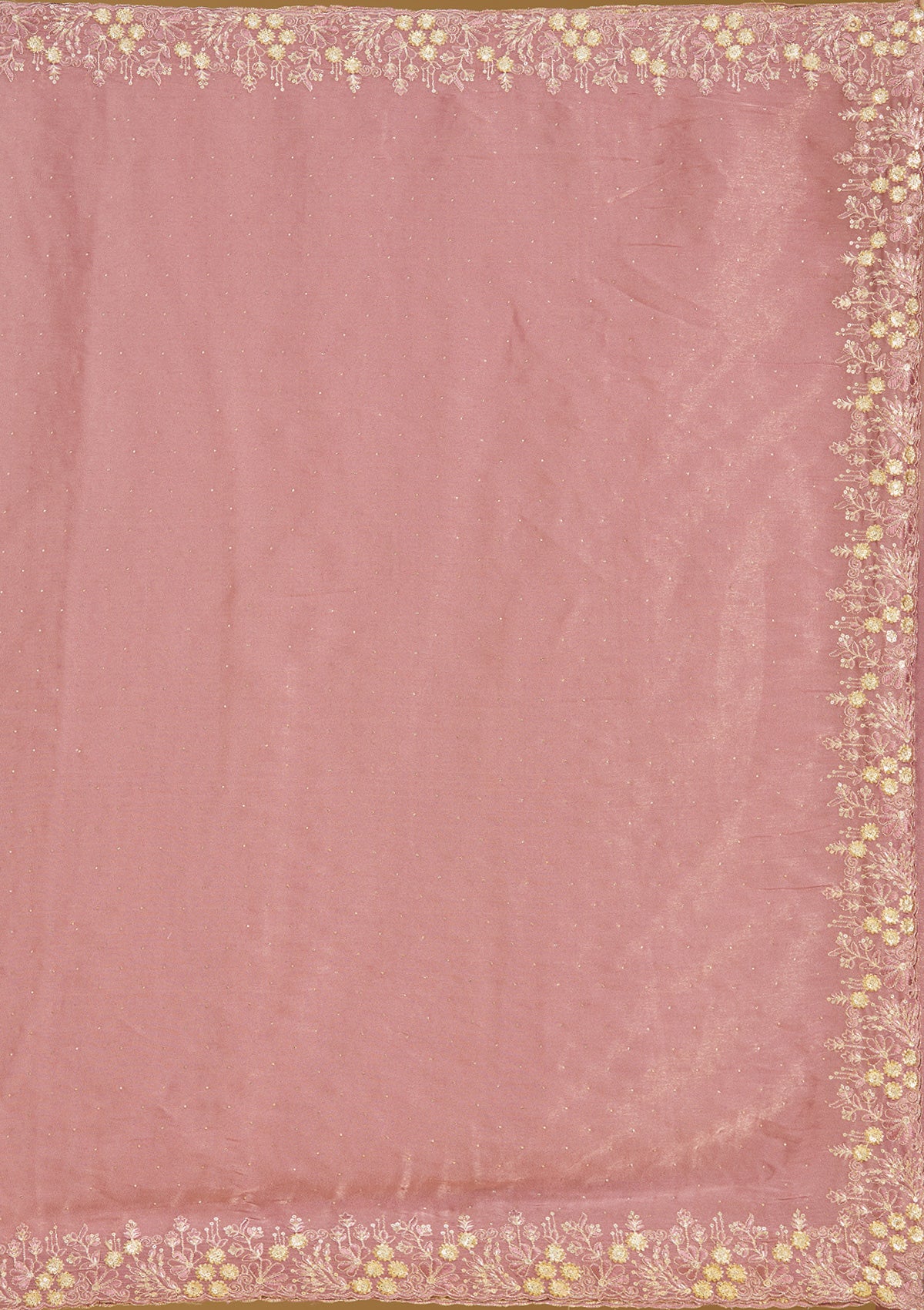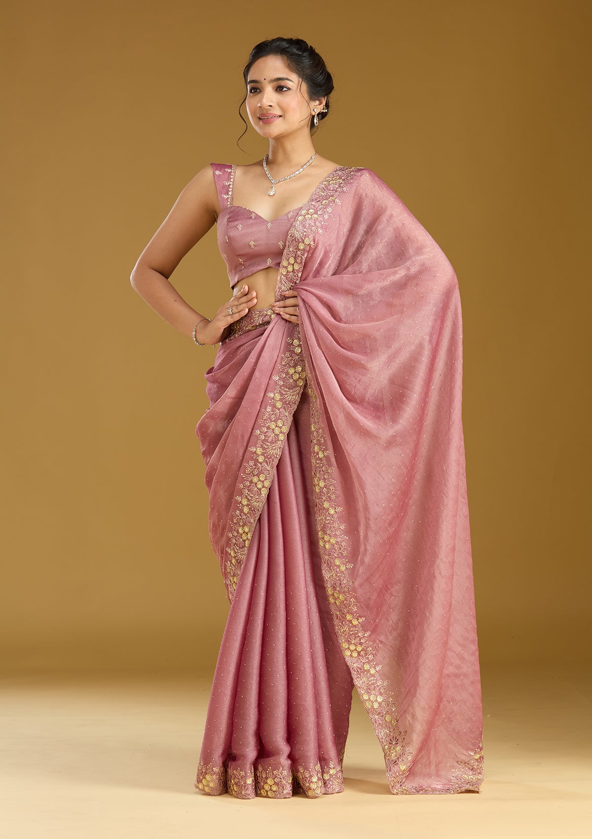 Onion Pink Saree in Tissue fabric. The Saree is elevated with Zariwork (Gold) embroidery. It comes with an Unstitched blouse. Comes with the Koskii promise of premium quality.