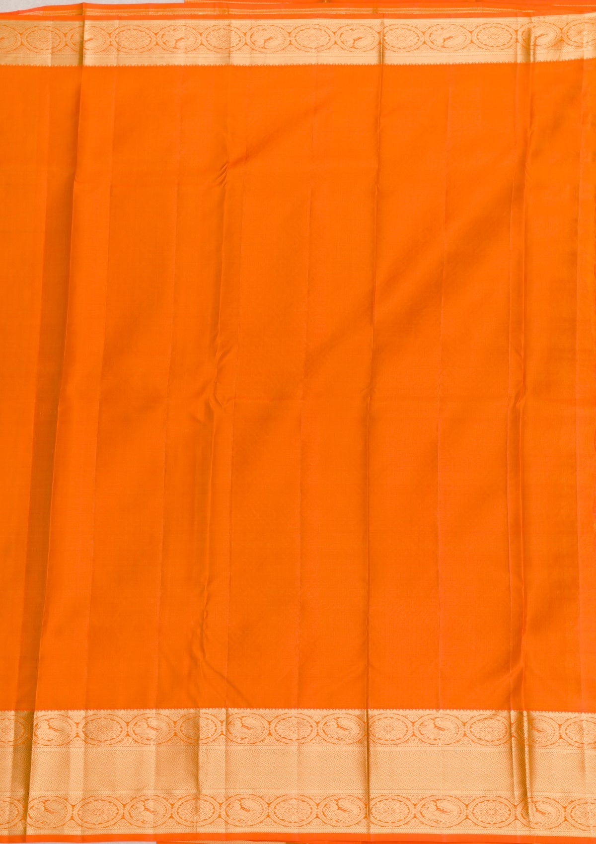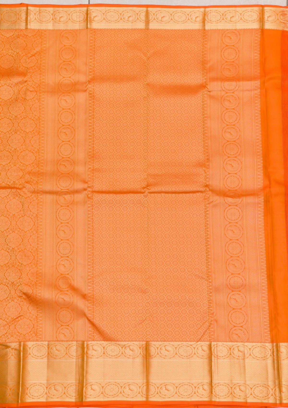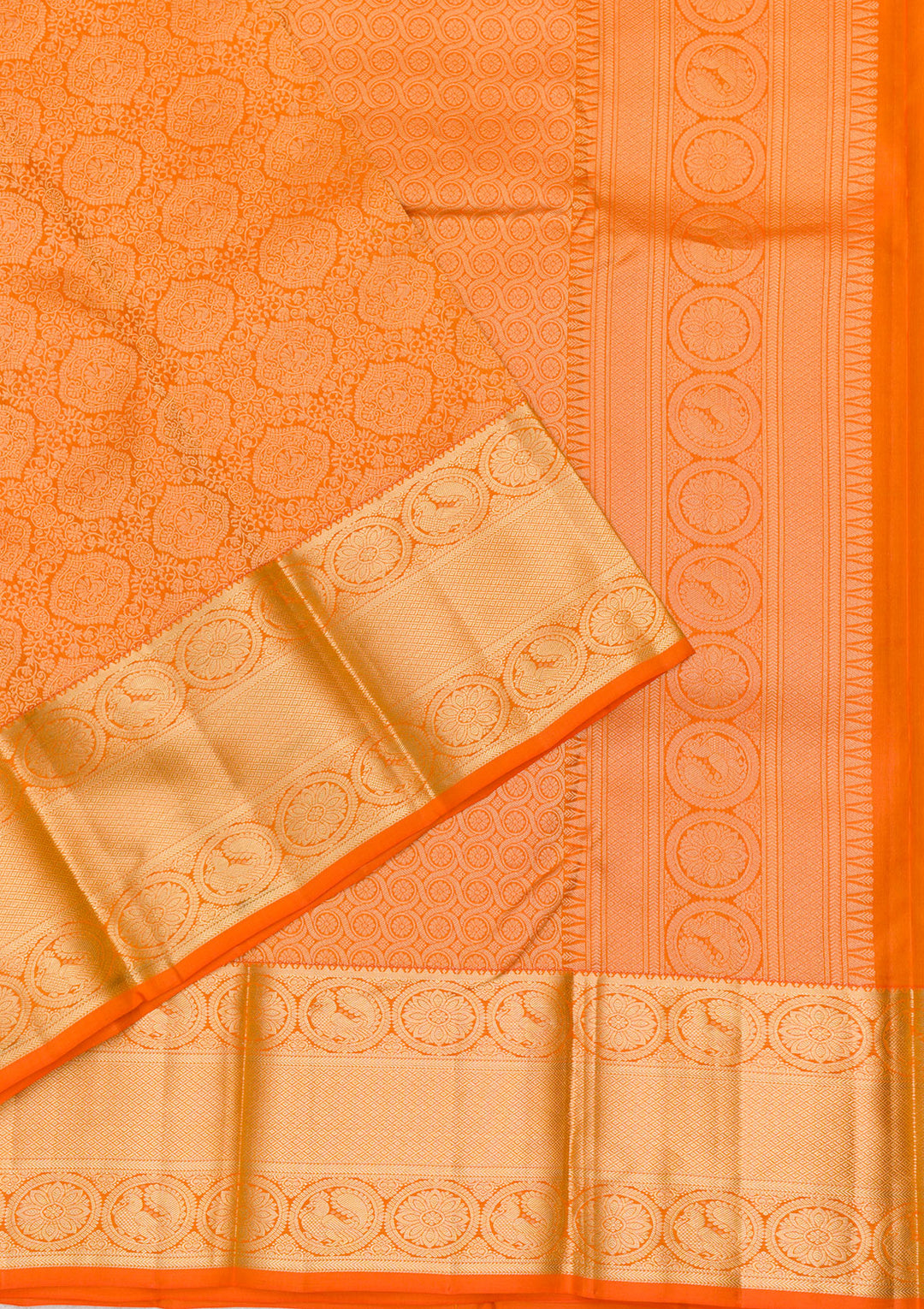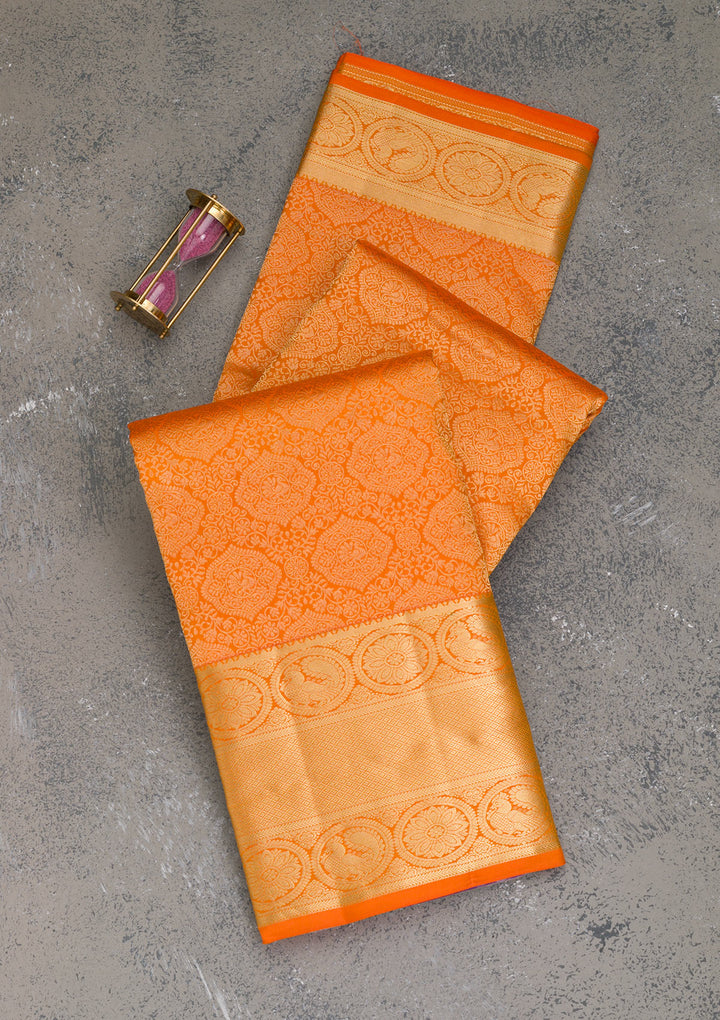 Orange Saree in Pure Silk fabric. The Saree is elevated with Zariwork embroidery. It comes with an Unstitched blouse. Comes with the Indian Silk Mark certification.