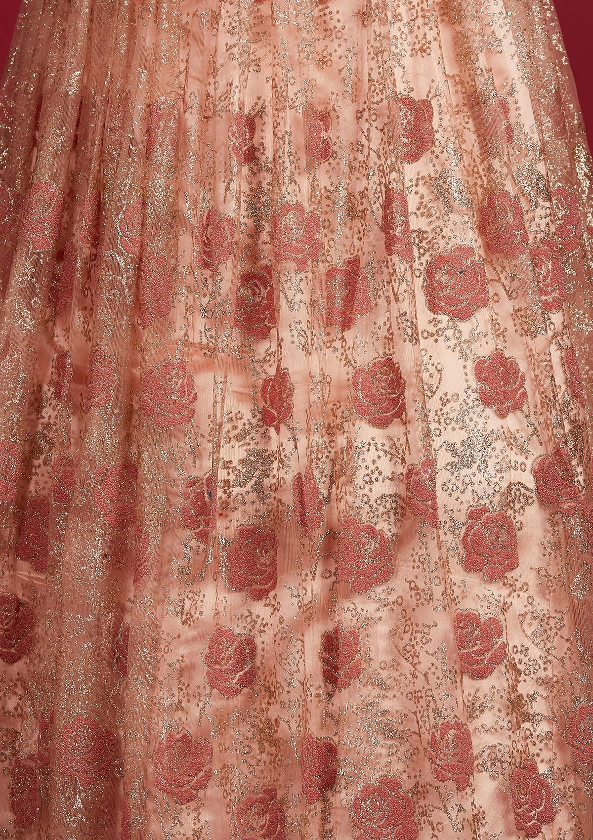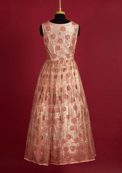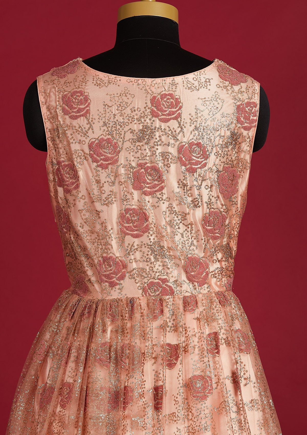 Peach designer gown in net fabric. The flared floor length sleeveless gown has a round neckline. Embellished with glitter embroidery. Comes with the koskii promise of superior quality.
