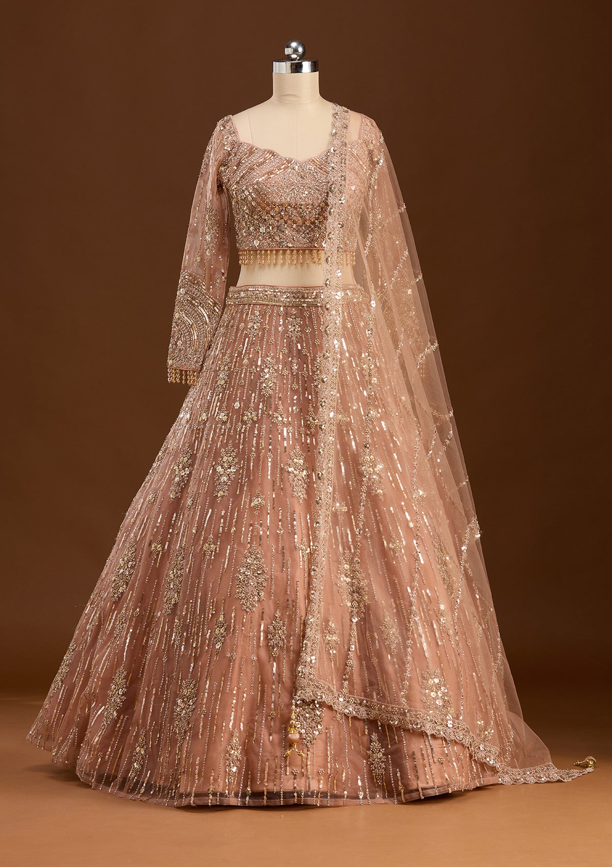 Peach Sequins Net Readymade Lehenga