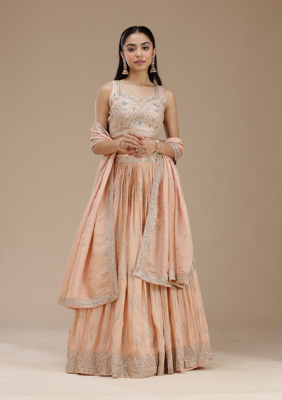 Peach Readymade Lehenga in Shimmer fabric The Lehenga is embellished with Sequins embroidery Accompanied with an Readymade blouse and dupatta Comes with the Koskii promise of premium quality.