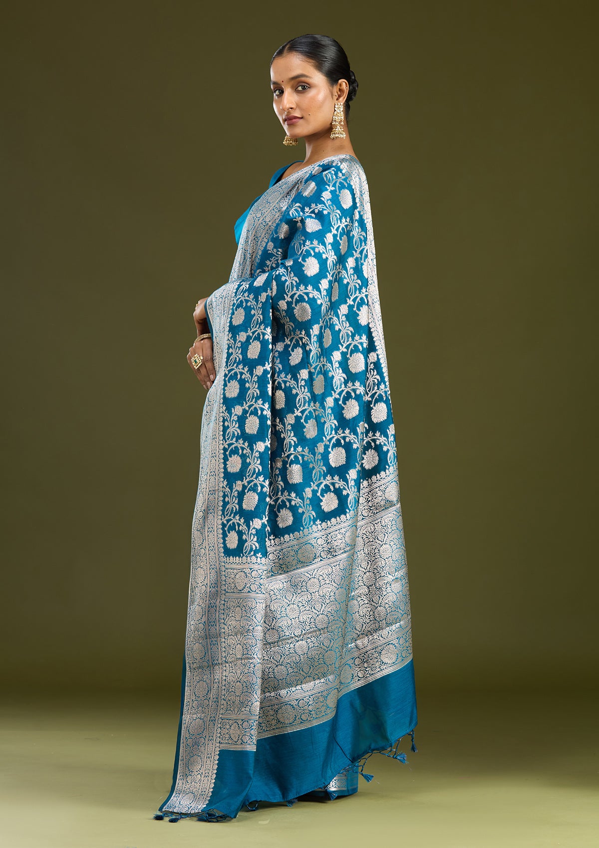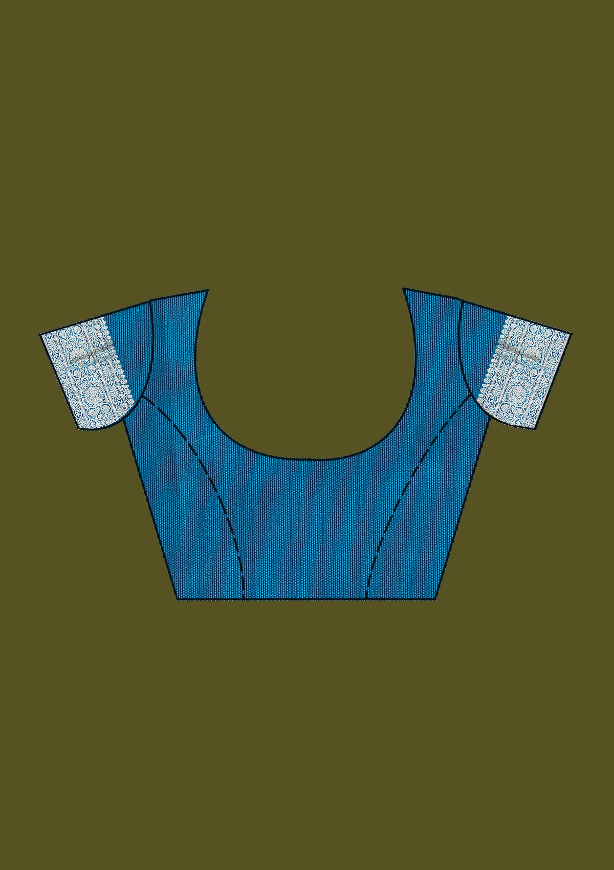 Peacock Blue Silk_Saree in Cotton fabric. The Silk_Saree is elevated with Zariwork embroidery. It comes with an Unstitched blouse. Comes with the Koskii promise of premium quality.