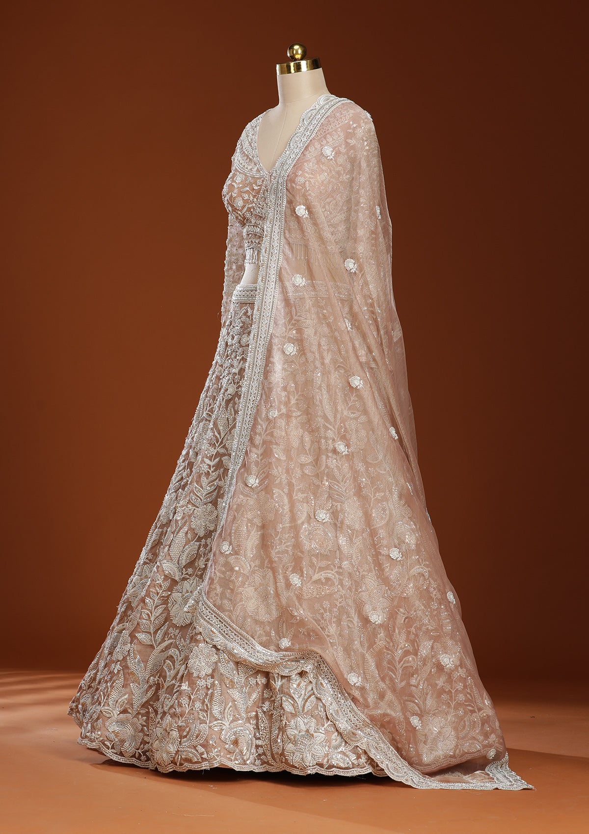 Pink Readymade Lehenga in Organza fabric. The Lehenga is embellished with Threadwork embroidery. Accompanied with an Readymade blouse and dupatta. Comes with the Koskii promise of premium quality.