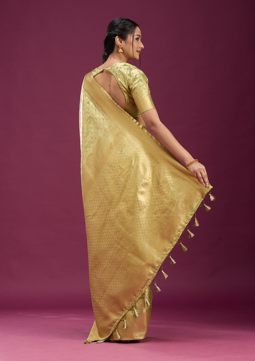 Pista Green Saree in Silk fabric The Silk Saree is elevated with Zariwork (Gold) embroidery It comes with an Unstitched blouse Comes with the Koskii promise of premium quality.