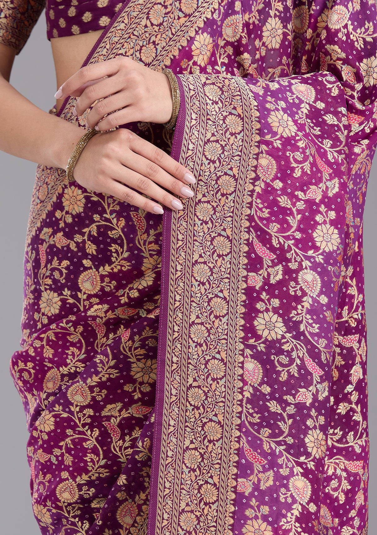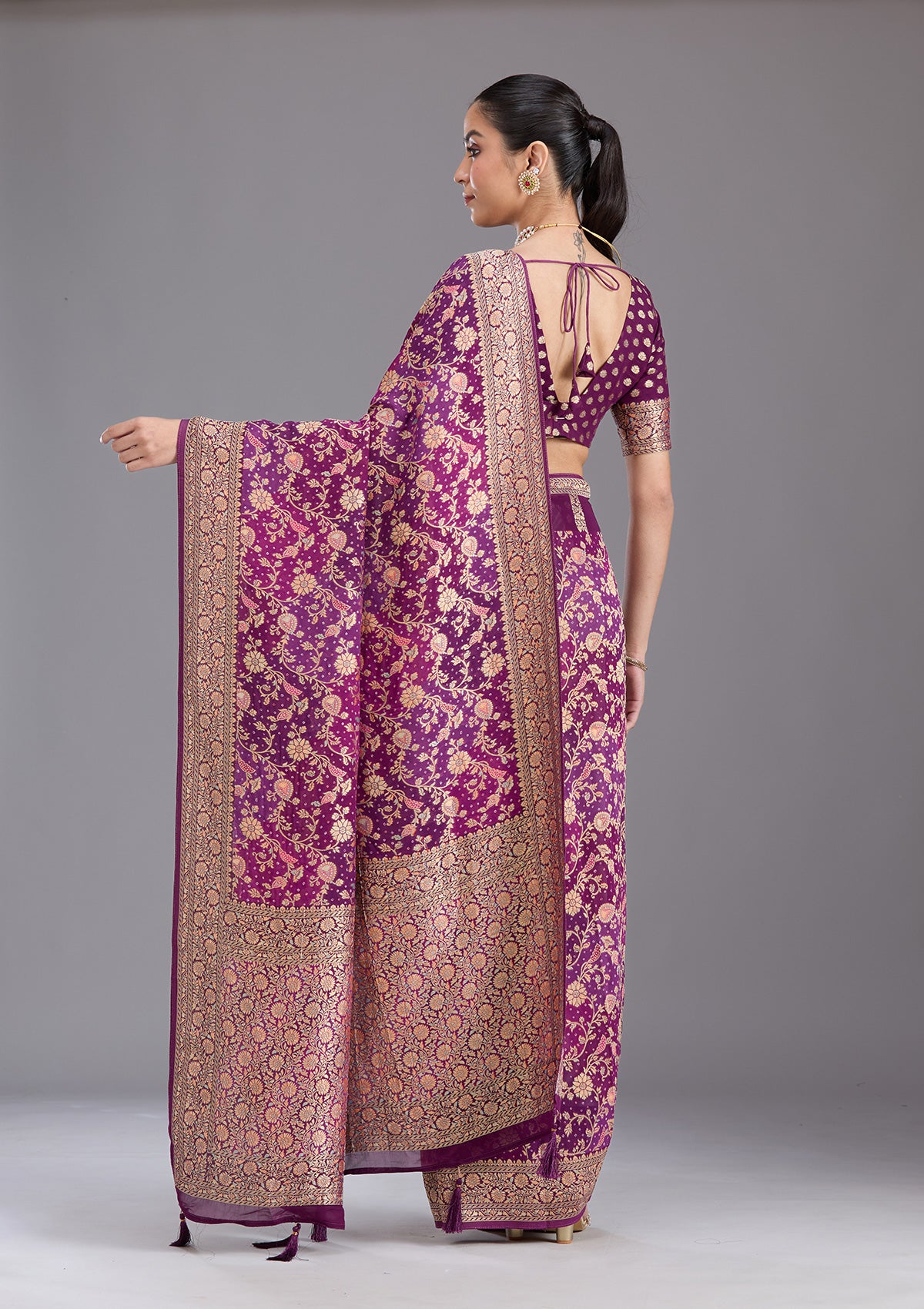 Purple Saree in Silk fabric The Silk Saree is elevated with Banarasi embroidery It comes with an Unstitched blouse Comes with the Koskii promise of premium quality.