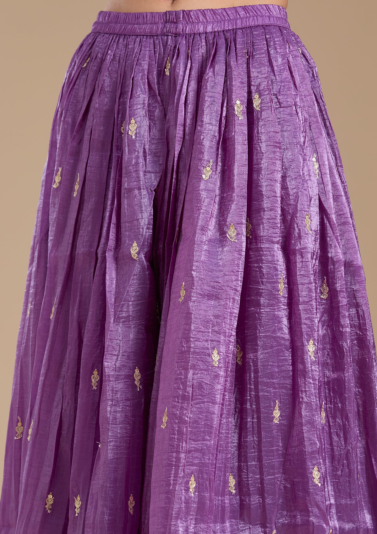 Purple Salwar_RM in Soft Raw Silk fabric. The Salwar_RM is embellished with Zariwork (Gold) embroidery. Accompanied with a bottom and dupatta. Comes with the Koskii promise of premium quality.
