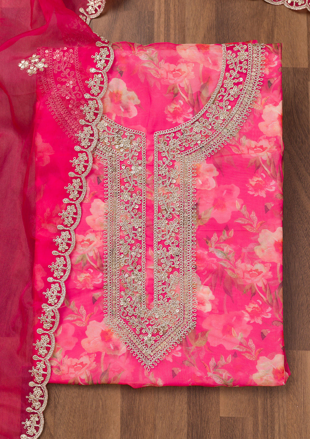 Rani Pink Printed Organza Unstitched Salwar Suit