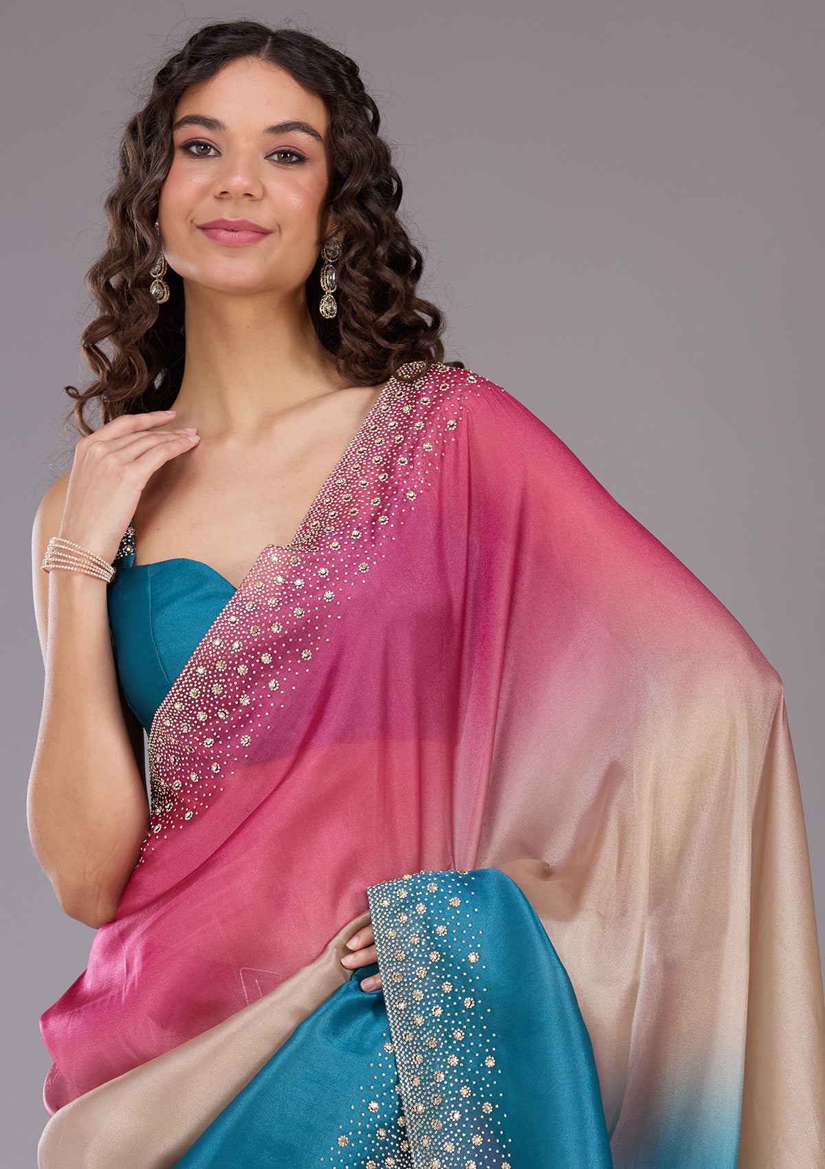 Rani Pink Saree in Tissue fabric. The Saree is elevated with Stonework (Gold) embroidery. It comes with an Unstitched blouse. Comes with the Koskii promise of premium quality.