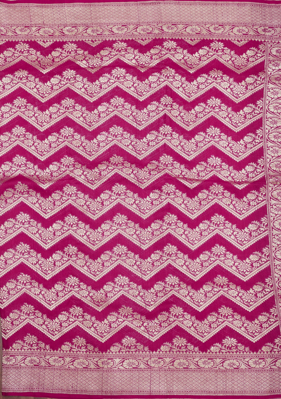 Rani Pink Saree in Pure Silk fabric. The Saree is elevated with Zariwork embroidery. It comes with an Unstitched blouse. Comes with the Koskii promise of premium quality.