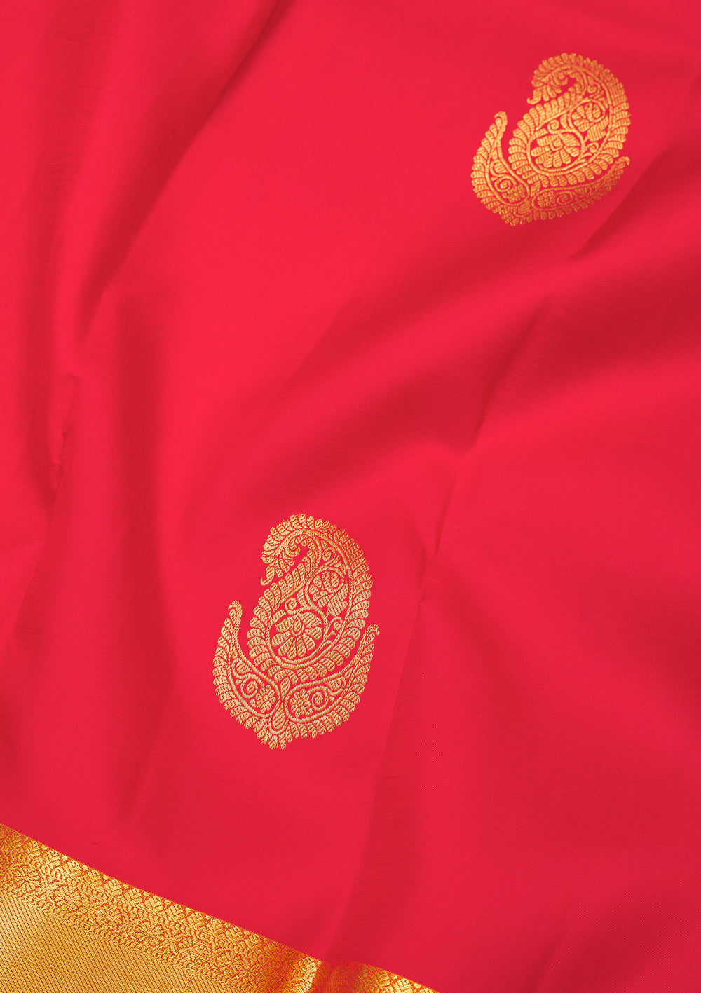 Red Saree in Pure Silk fabric. The Saree is elevated with Zariwork embroidery. It comes with an Unstitched blouse. Comes with the Indian Silk Mark certification.
