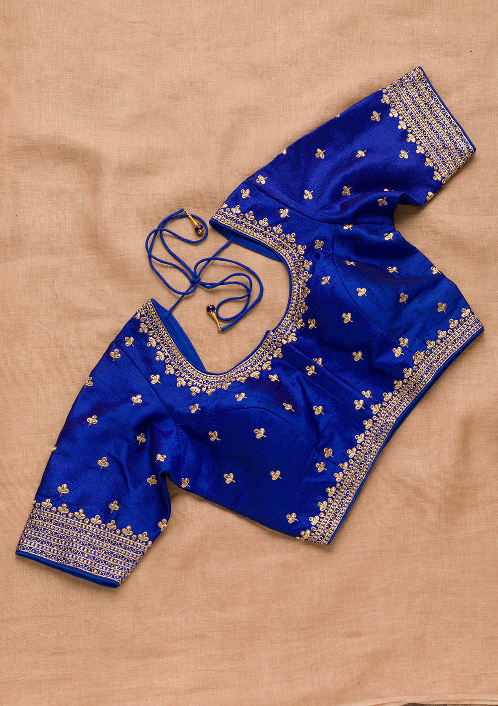 Royal Blue Ready to Wear Padded Blouse in Raw Silk fabric The Zariwork Blouse has a U Neckline Comes with the Koskii promise of premium quality.