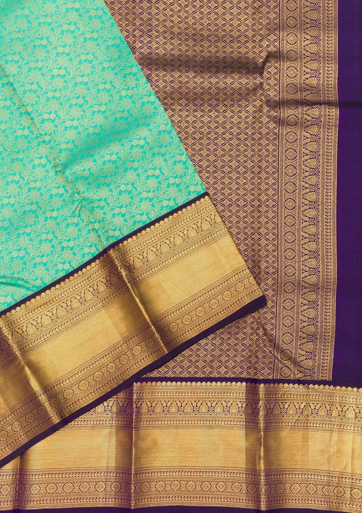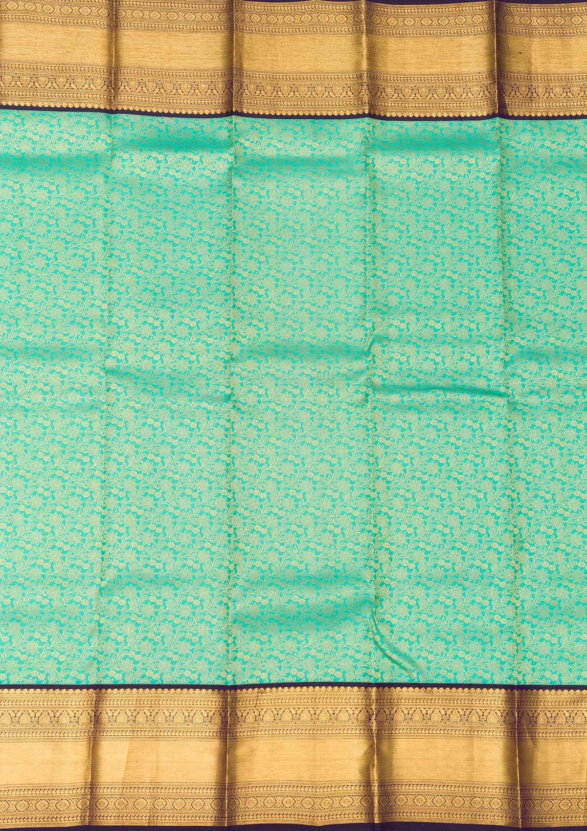 Sea Green Saree in Pure Silk fabric. The Saree is elevated with Zariwork embroidery. It comes with an Unstitched blouse. Comes with the Indian Silk Mark certification.