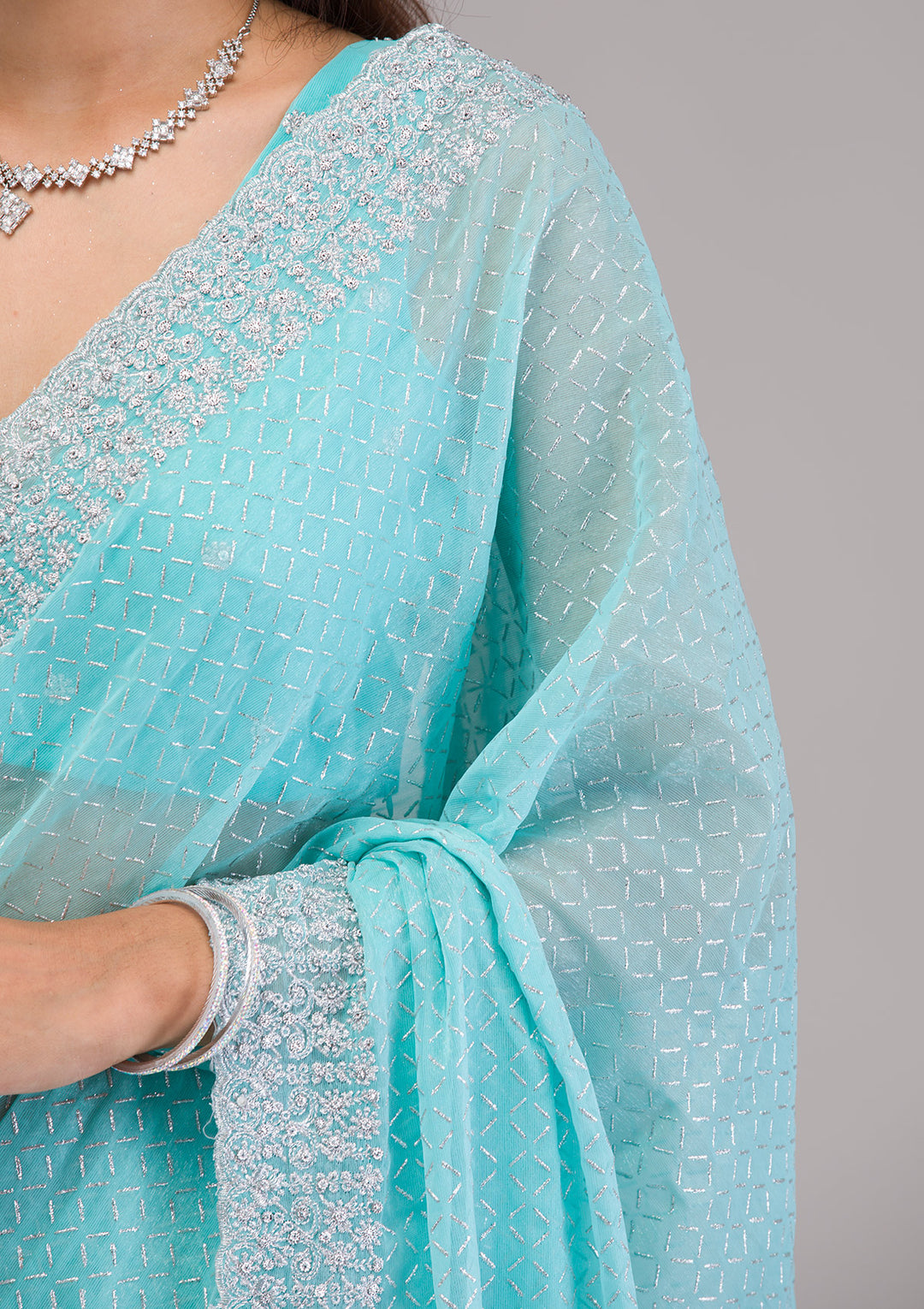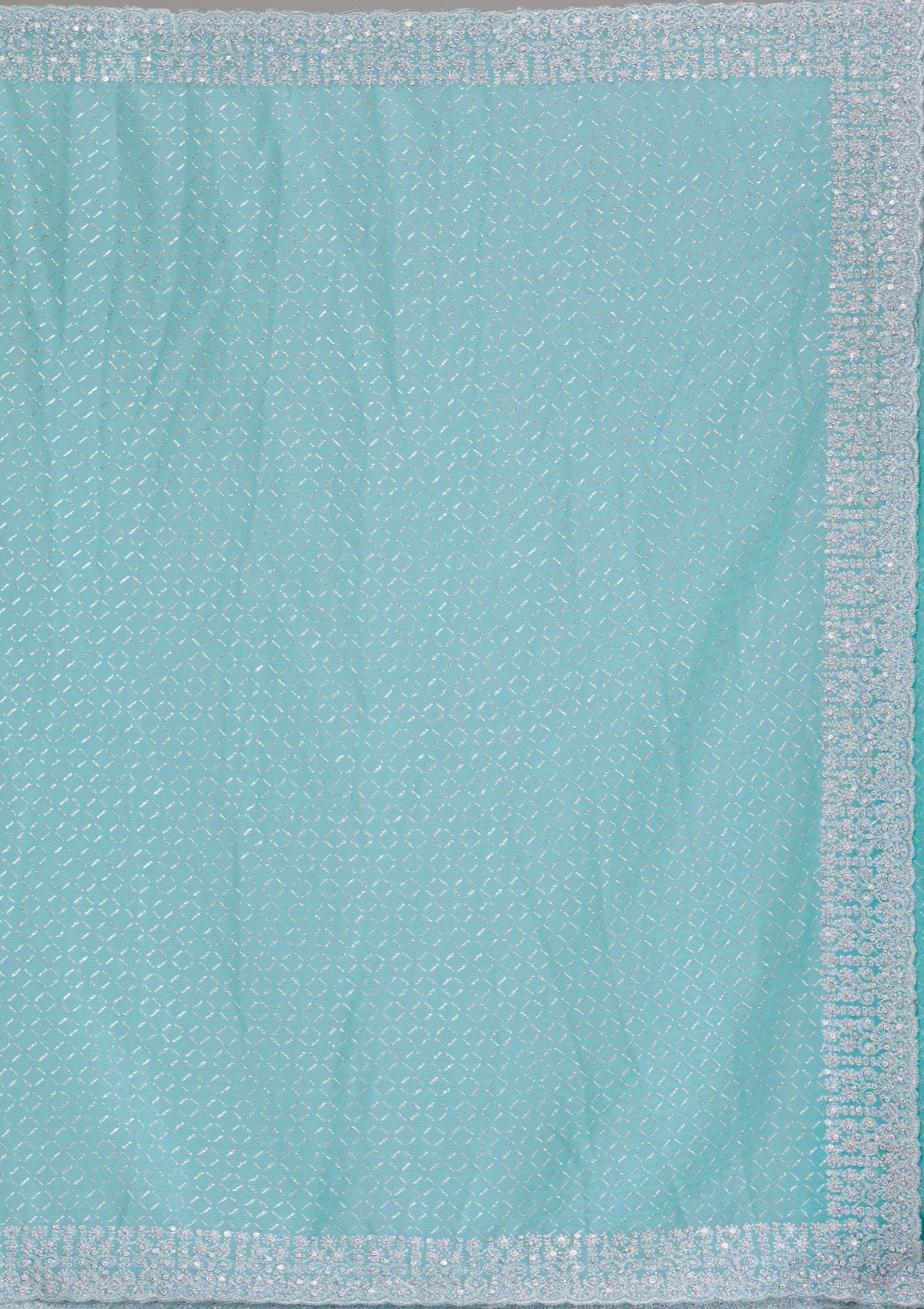 Sky Blue Saree in Georgette fabric. The Saree is elevated with Stonework embroidery. It comes with an Unstitched blouse. Comes with the Koskii promise of premium quality.