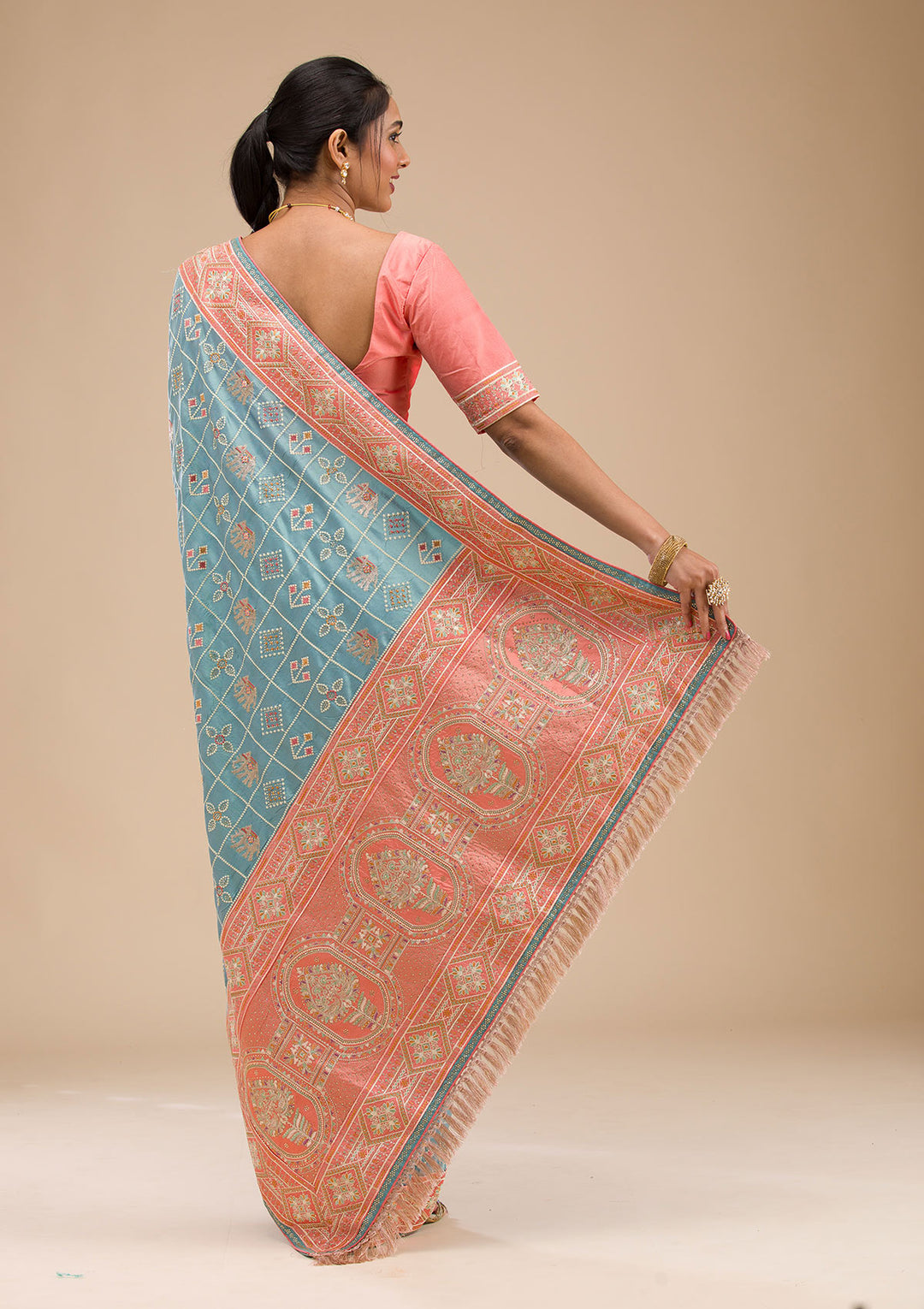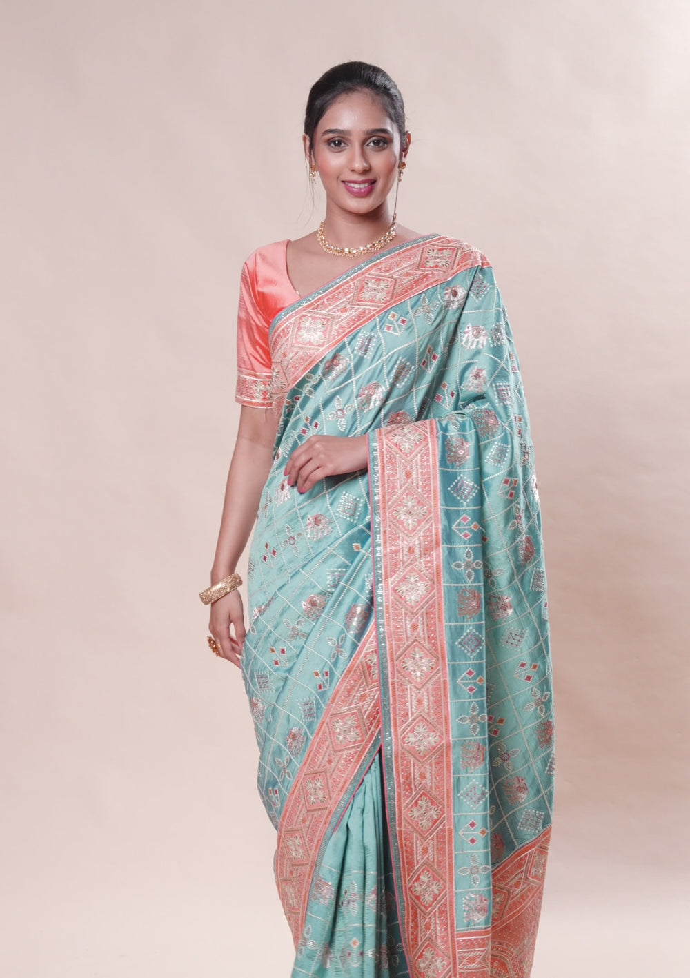 Turquoise Blue Saree in Semi Crepe fabric. The Saree is elevated with Threadwork embroidery. It comes with an Unstitched blouse. Comes with the Koskii promise of premium quality.